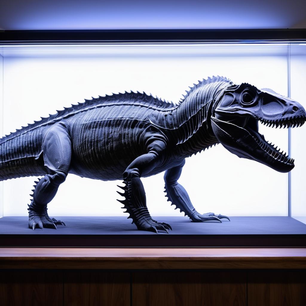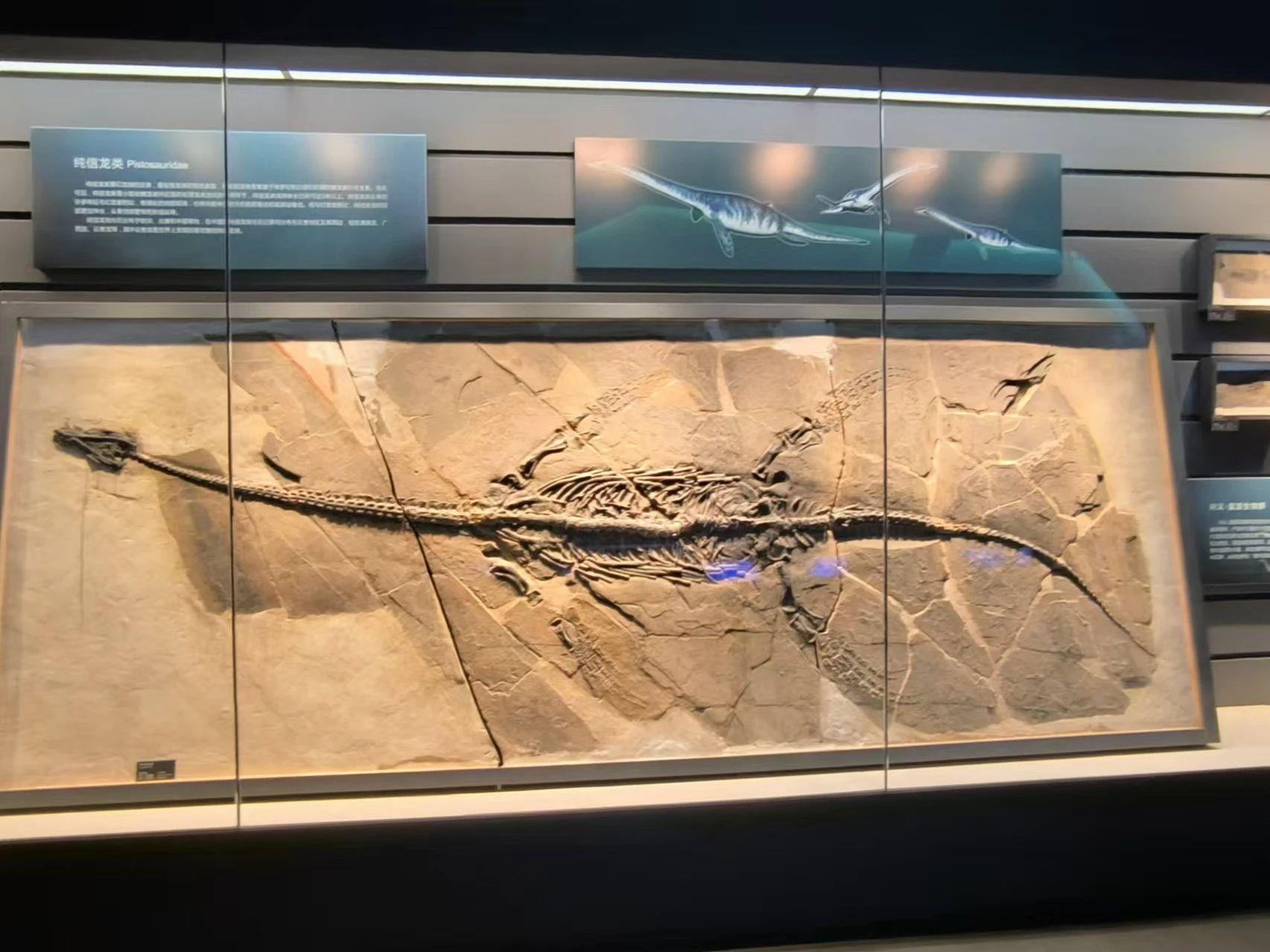 这幅作品展示了一具完整的古生物化石,可能是一种海生爬行动物。化石被精心嵌入展览板中,显示出其细致的骨骼结构,尤其是长长的颈部和尾巴。背景采用柔和的灯光,突出化石的纹理和细节,营造出一种历史的厚重感与神秘氛围。展板上的信息介绍了该生物的特征和历史背景,增加了科学性和教育价值。