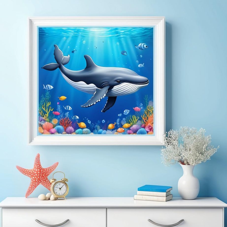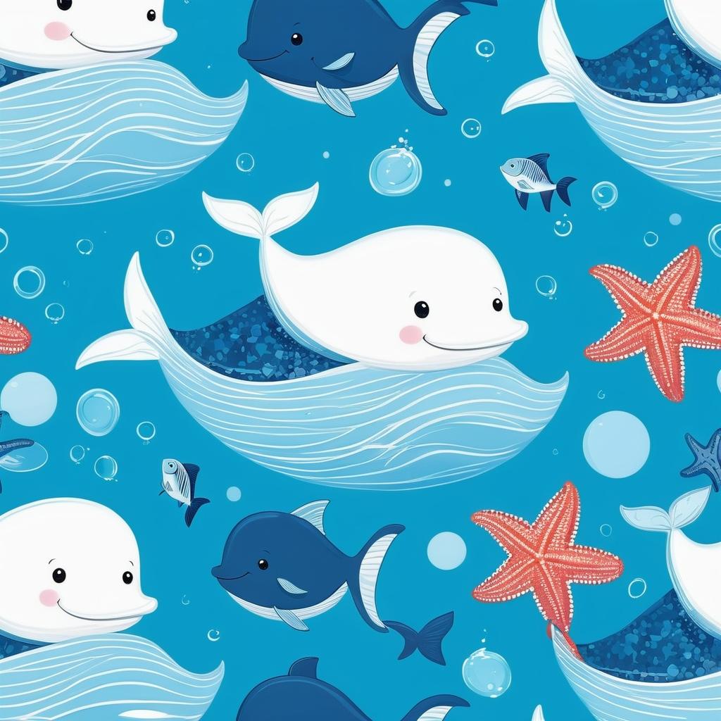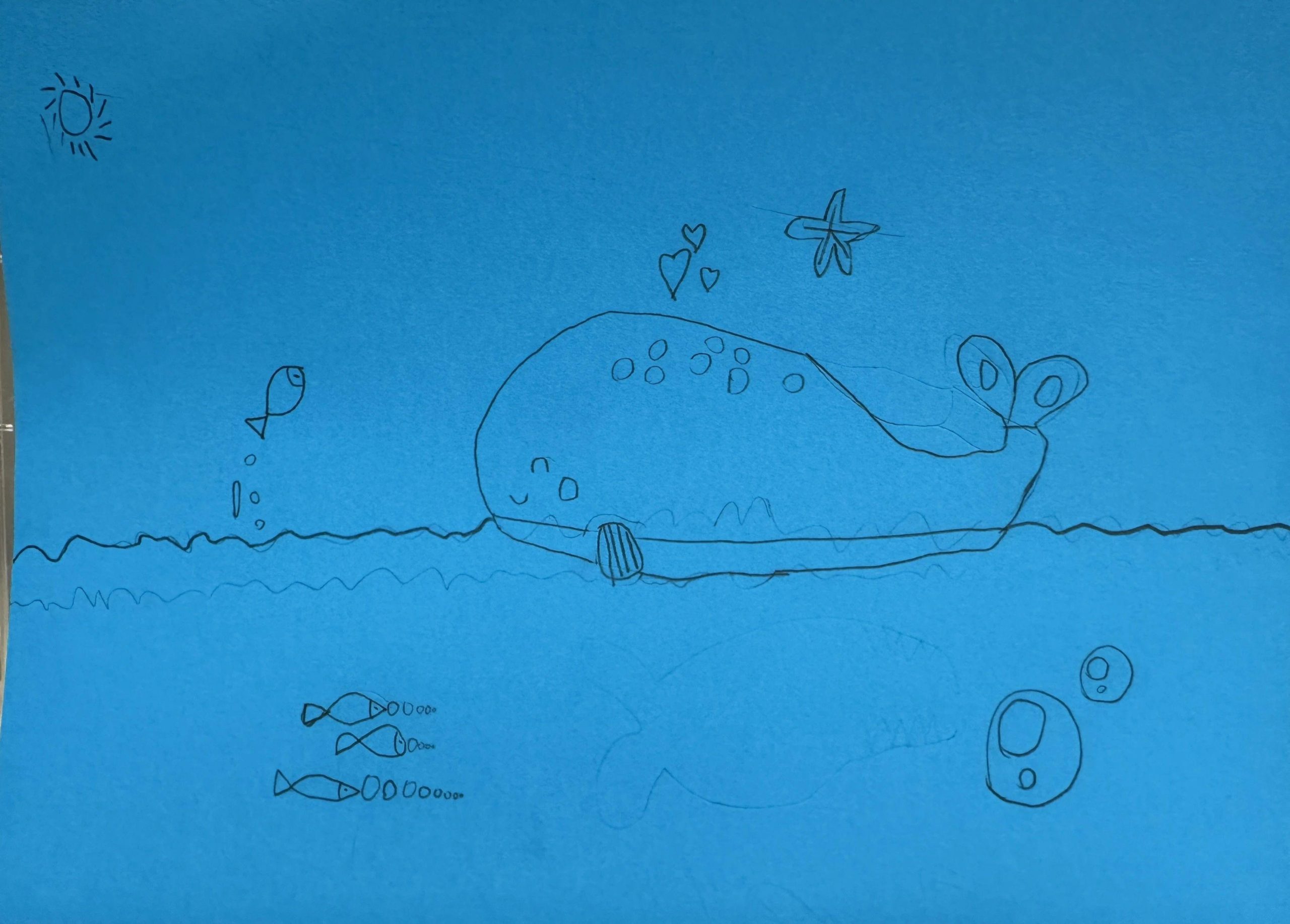 这幅作品使用了简单的线条和蓝色背景,描绘了一只微笑的鲸鱼和几条鱼。心形和海星的元素增添了画面的童趣和友好氛围。整体构图简洁,色彩单一但富有表现力,传达了海洋的宁静与和谐。