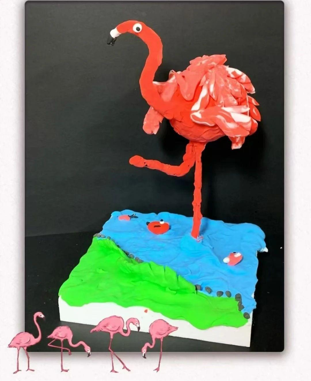 这幅作品通过简单而鲜艳的色彩组合,成功地引起观众的兴趣,特别适合儿童的审美和理解能力。可以考虑通过增加更多的细节,如在基座上添加更多的小动物或植物元素,使场景更加丰富多彩。增加一些背景元素,如天空或其他火烈鸟,以扩展作品的叙事维度。此外,可以使用不同的材料来增加作品的质感,比如使用黏土或纸浆来塑造更为立体的形象。通过这些改进,可以使作品在视觉上更具吸引力,同时也为观众提供更多的想象空间。