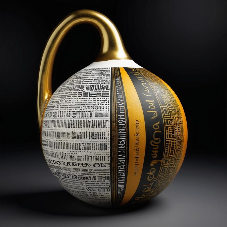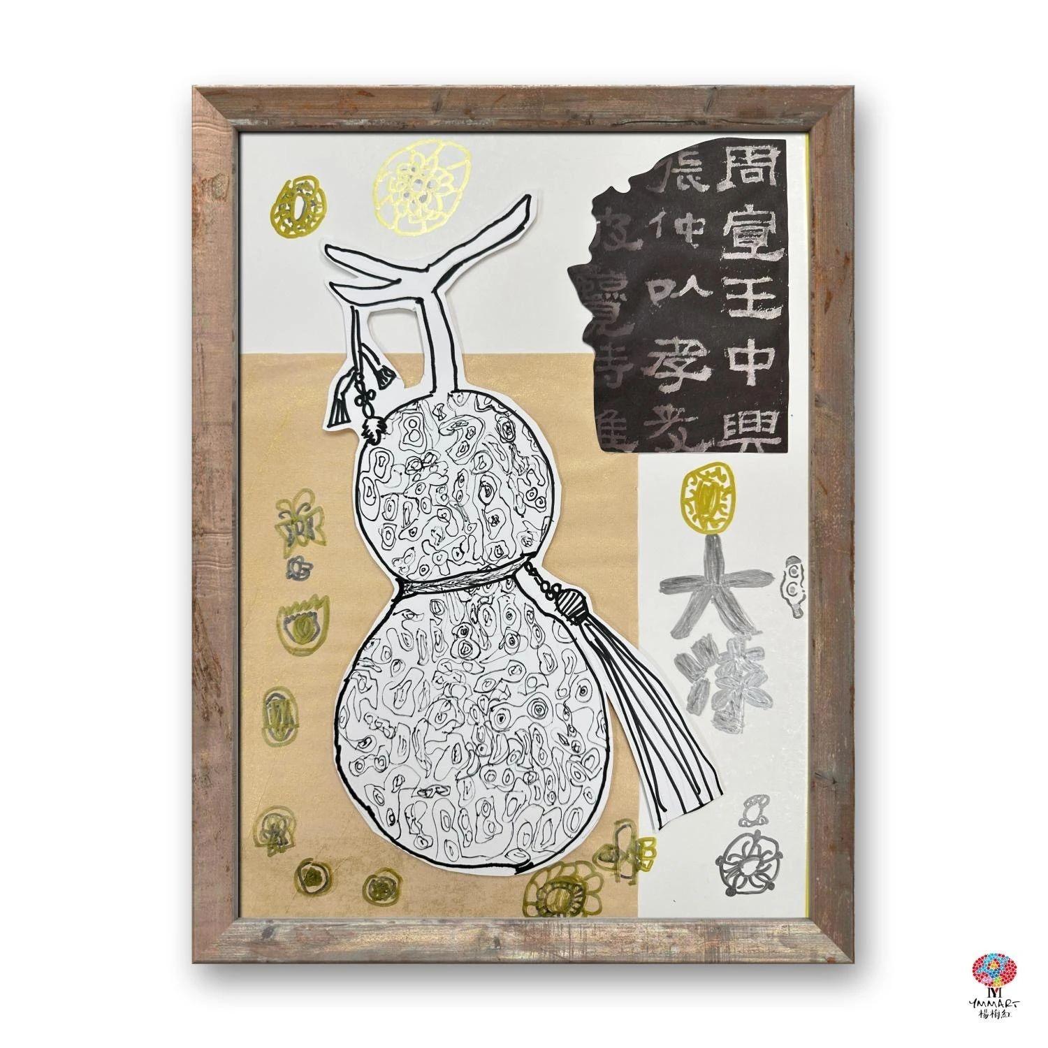 这幅作品结合了传统和现代元素。画面中心是一只葫芦,线条简洁流畅,背景采用了古典的文字元素,呈现出一种古今交融的风格。颜色上以金色、白色、黑色为主,营造出简约而富有质感的视觉效果。整个构图平衡,左侧的线条和右侧的文字形成了良好的对比,传达出一种和谐美。