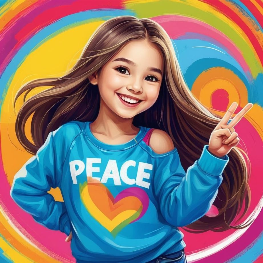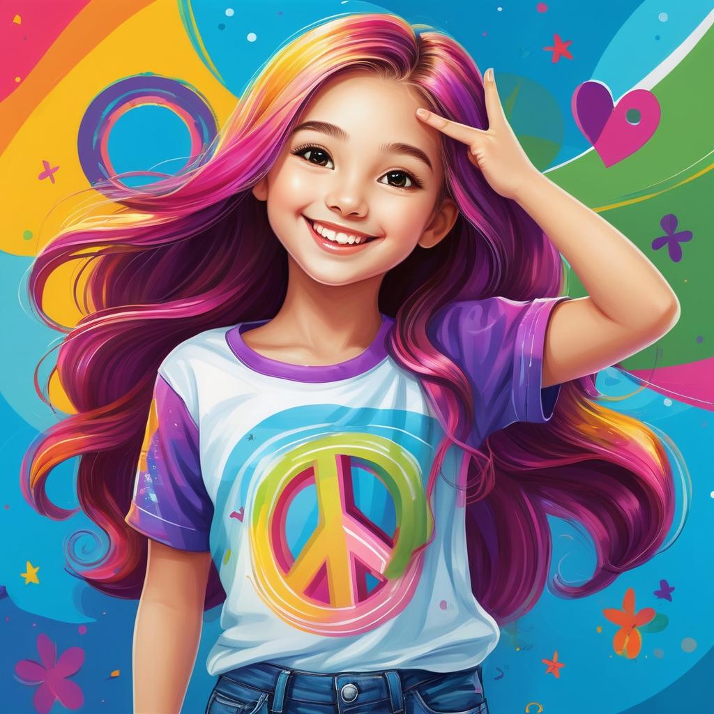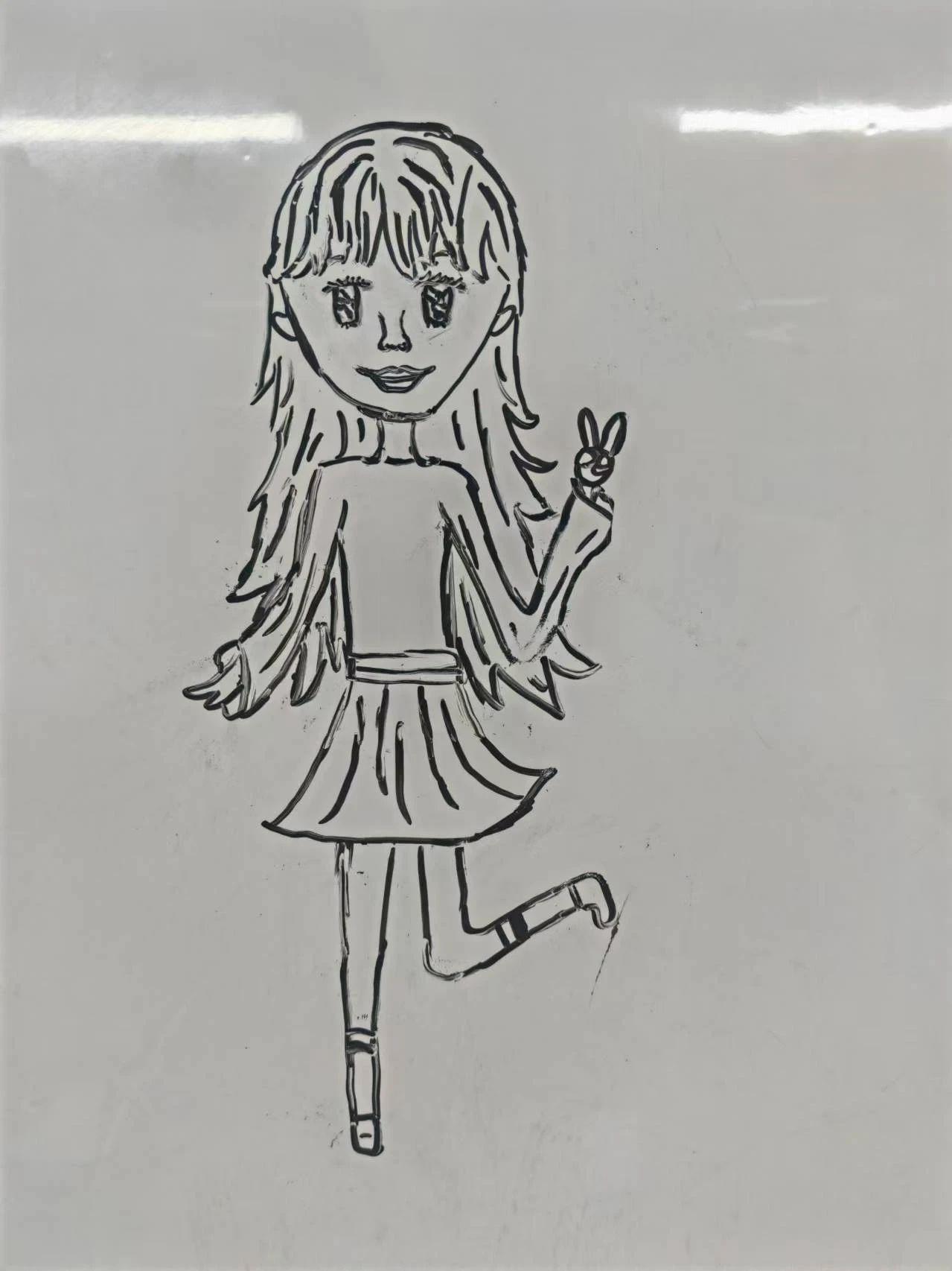 这幅线条画以其简约和充满活力的表现吸引了我们的注意。作品中描绘了一位年轻女子,微笑着做出胜利的手势,呈现出一种轻松的氛围。画作的简洁风格与人物的生动姿态形成了鲜明对比,展现了儿童艺术特有的天真和活泼。这种风格的作品可以唤起观众对童年时光的美好回忆,同时也能激发对创造力的无限遐想。