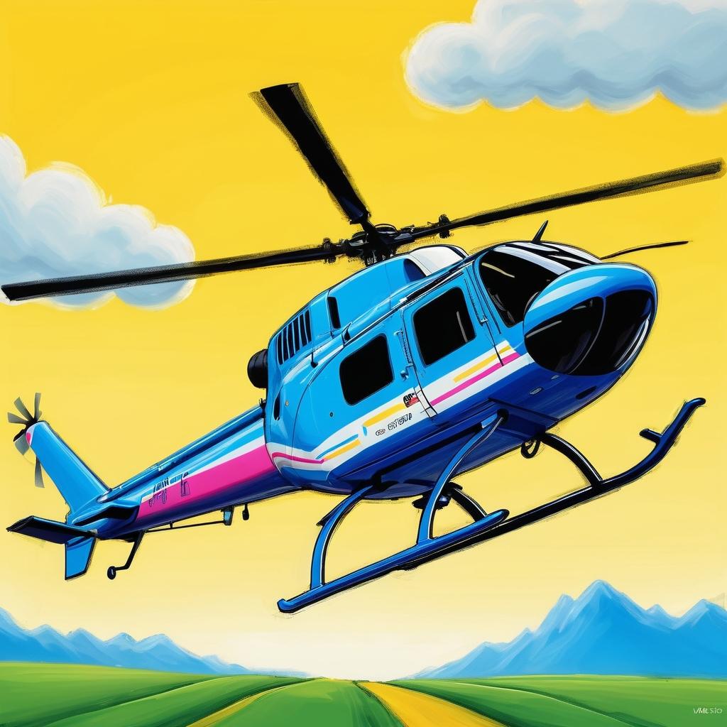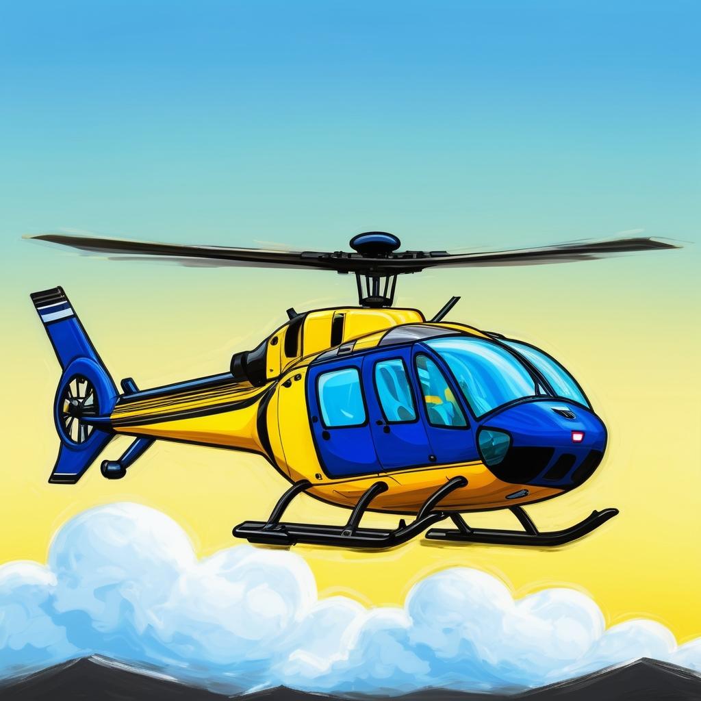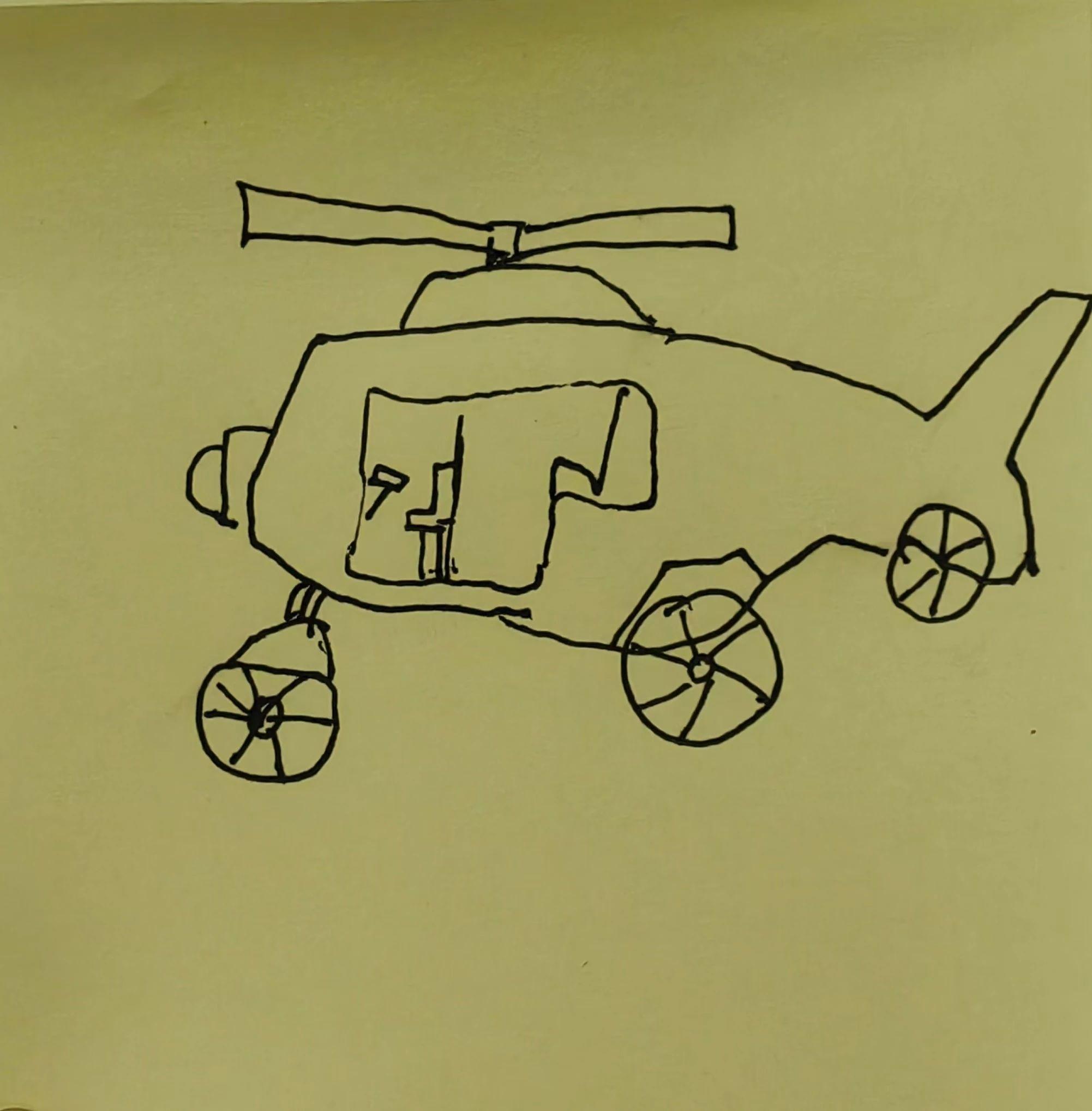 这幅作品是一幅简单的直升机线稿,使用黑色线条在黄色背景上绘制。构图简洁,线条流畅,展现了创作者对机械形态的理解和表达。作品传达了一种天真和直接的艺术风格,可能反映了创作者对飞行器的好奇与想象。