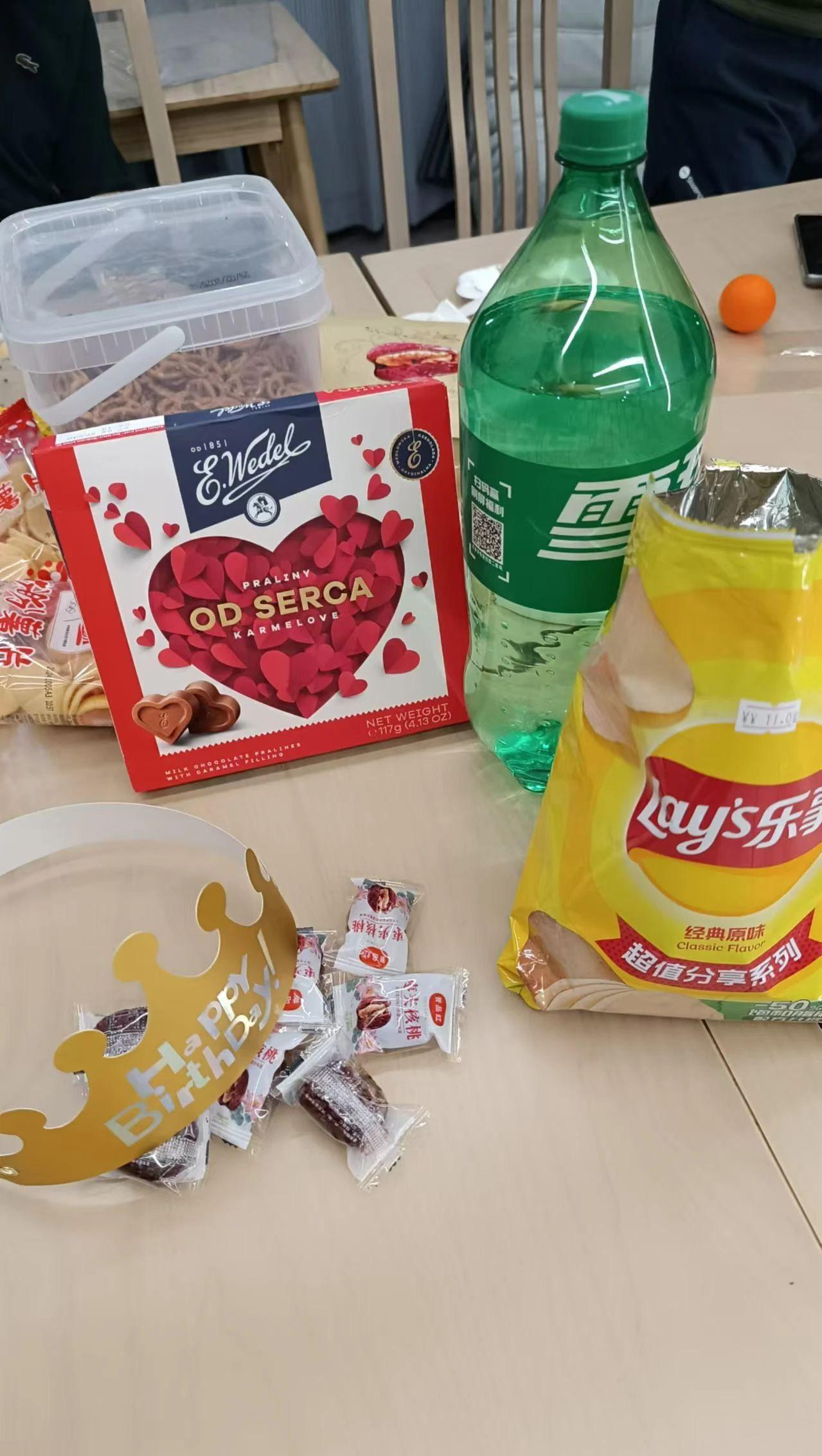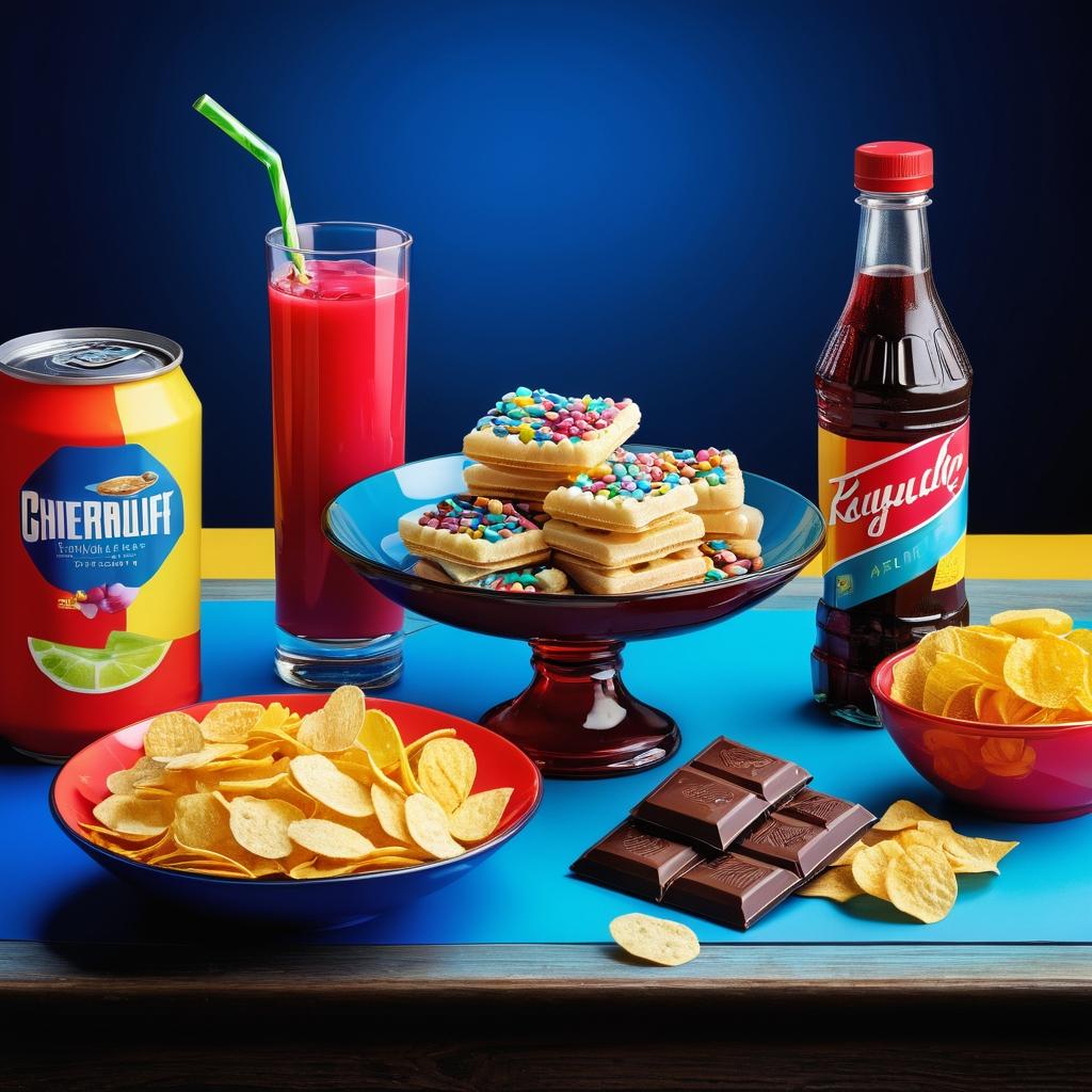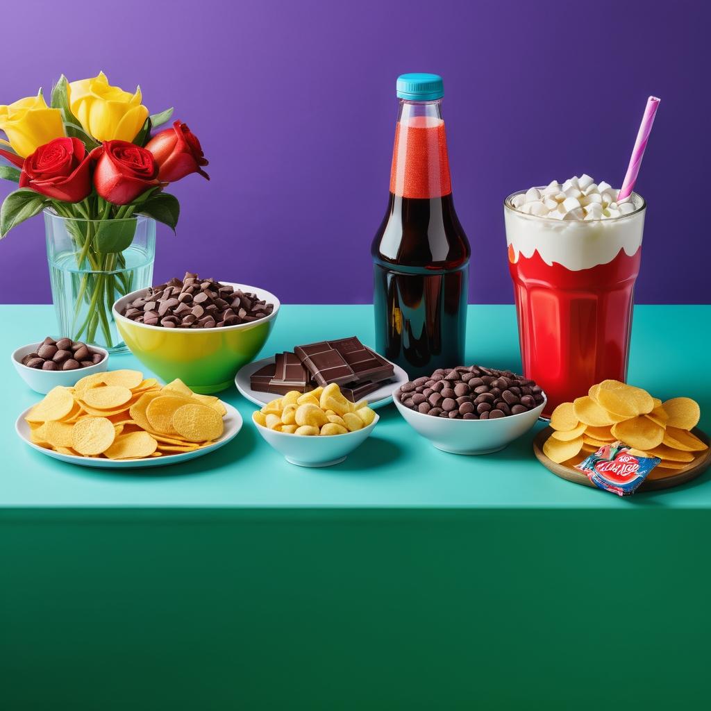 图片展示了一桌零食与饮品,包括巧克力、薯片、饮料和小零食,背景是一张桌子和椅子,整体氛围轻松、休闲。主要颜色是红色、黄色和绿色,营造出一种欢快的聚会氛围。
