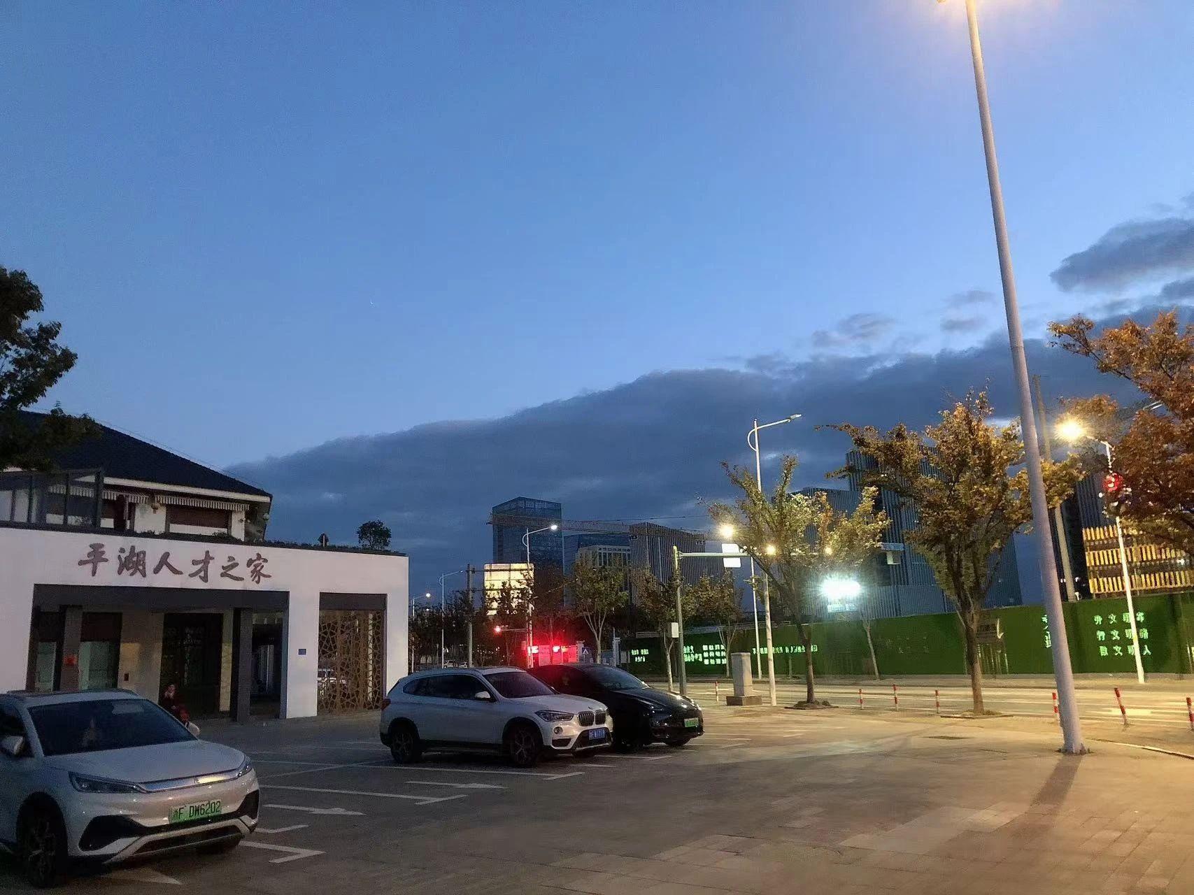 照片展示了一个城市街道的黄昏场景,主体是一个标有‘平湖人才之家’的建筑。画面中车辆停放整齐,树木在路灯的照耀下投下长长的阴影。天空呈现出深蓝色,给人以宁静的感觉。整体构图平衡,前景的建筑物和背景的天空形成了对比。