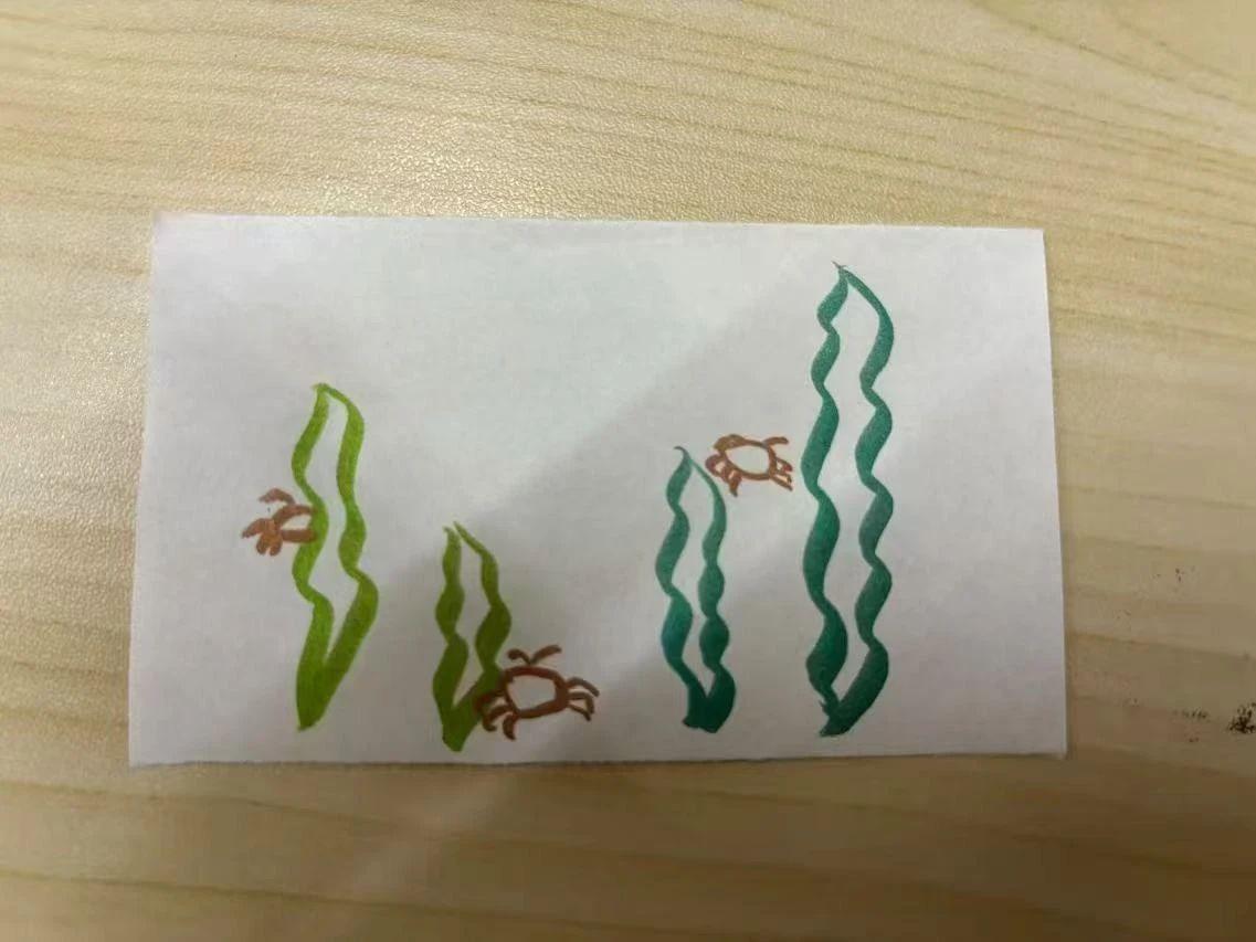 这幅作品通过简单的线条和色块展现了海洋的宁静之美,非常适合儿童的审美和理解能力。建议可以在背景中增加一些淡淡的蓝色,营造出更真实的海洋环境。同时,螃蟹的形态可以更为生动,增加一些动作感,比如在海草间游动或互相追逐。这样的设计能够吸引小朋友的注意力,让他们在欣赏画作的同时激发对海洋生物的兴趣。此外,可以在画作中加入一些小气泡或其他海洋生物元素,增加画面的丰富性和趣味性。