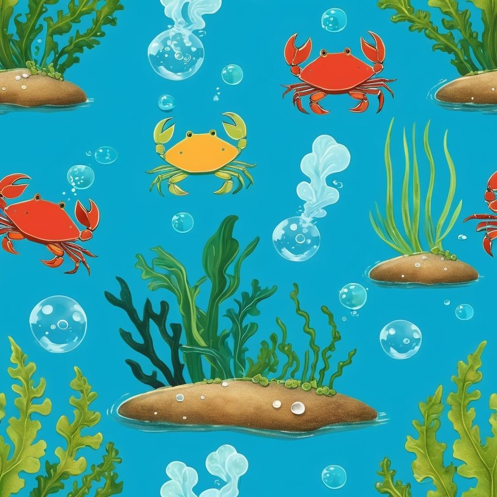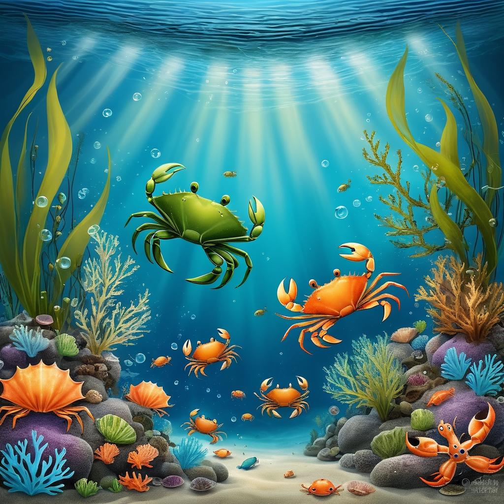 这幅画作以简单而富有童趣的方式呈现了海洋世界的美丽。作品中,柔和的绿色海草与棕色的小螃蟹相得益彰,共同营造出一种宁静而自然的氛围。这样的设计不仅让人想起了儿时的海边记忆,更是通过简约的表现手法,传达了一种与自然和谐共存的理念。对于儿童而言,这种风格的艺术作品尤为合适,因为它们可以在欣赏中轻松理解并感受自然的美好。为了进一步提升作品的艺术性和趣味性,可以在画作中加入淡淡的蓝色背景,模拟真实的海洋环境。此外,生动的螃蟹形态和丰富的海洋生物细节也能吸引儿童的注意力,激发他们的想象力和学习兴趣。这样的艺术不仅仅是视觉上的享受,更是情感和教育上的潜移默化,让孩子们在不知不觉中爱上大自然。