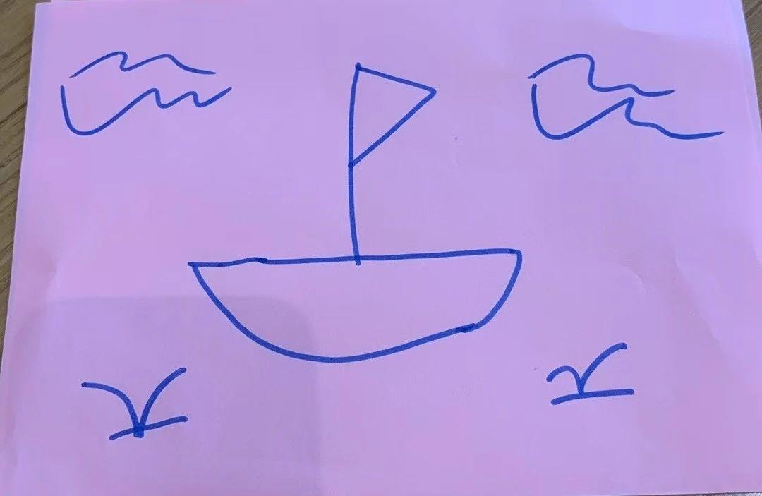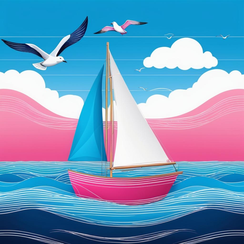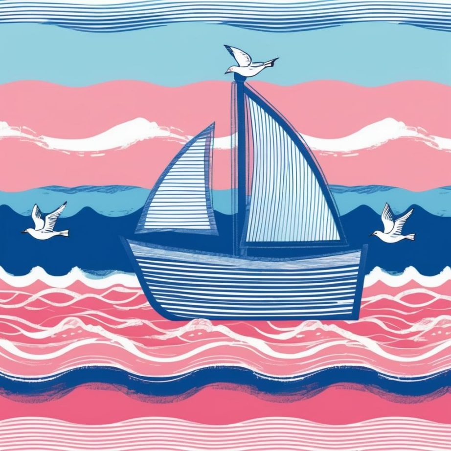 这幅画呈现了一个简单的船只图案,使用蓝色线条勾勒在粉色背景上。图中还有波浪和两只海鸥的简单图示。整体风格简洁明快,可能想表达一种海洋的自由和轻松氛围。