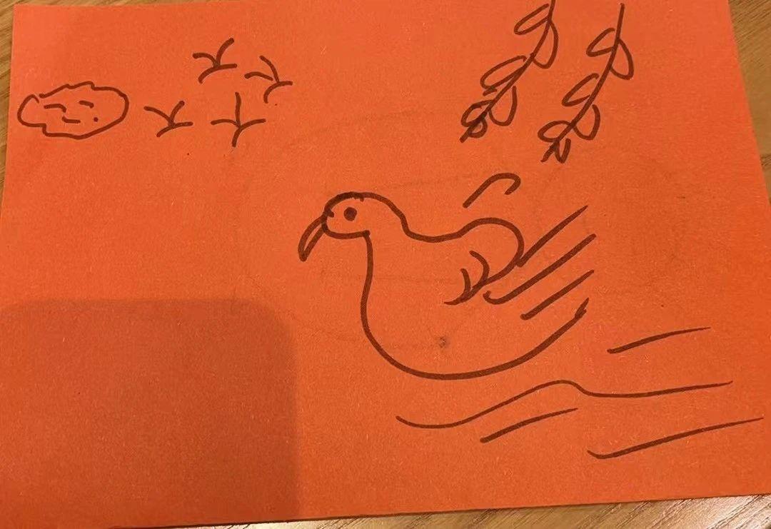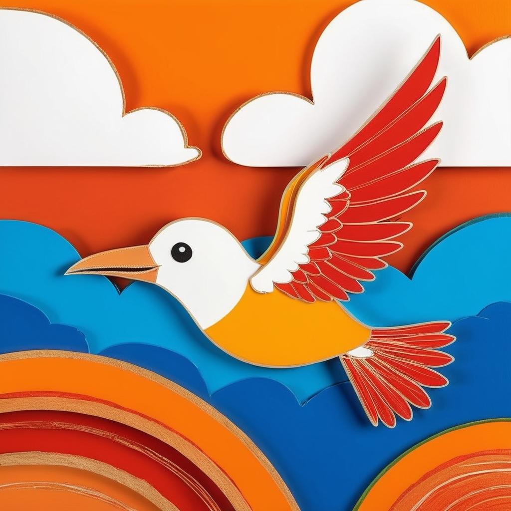 在这幅充满童趣的画作中,我们看到了艺术创作的纯真与自由。简单的线条勾勒出一只飞鸟,背景是鲜亮的橙色纸张,赋予作品一种温暖和活力。画中还有几只飞鸟、云朵和树枝,虽然构图简单,却充满了想象力。这种风格在儿童艺术中十分常见,展现了孩子们对世界的独特视角和无穷的创造力。