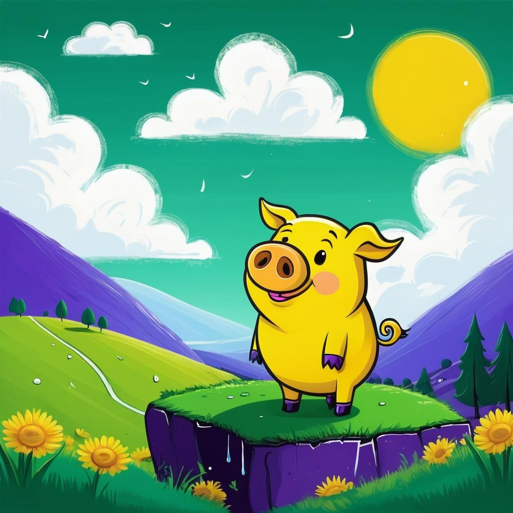 这幅画展现了一个黄色的卡通人物,可能是一只小猪,正在流泪,背景是简单的绿色山丘和平原。画面中还有一个紫色的人物和一个黄色的小物体。色彩鲜明,线条简洁,传递出一种纯真的情感,可能表达了失落或悲伤的主题。