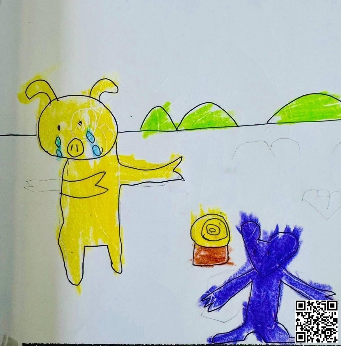 这幅儿童画作以其简单却强烈的情感表达吸引了我们的注意。画中,黄色的小猪流下的泪水成为整个作品的情感中心。简单的线条和鲜明的色彩运用,展现了儿童画作中常见的纯真与直接。背景中的绿色山丘为整幅画增添了一层宁静的氛围,似乎在与小猪的悲伤情绪形成对比。通过这幅画,我们可以感受到小艺术家心中的世界是如何通过色彩和线条表达出来的。为了丰富画面的表现力,建议可以在背景中加入更多细节元素,例如云朵或太阳,这不仅能增加画面的层次感,也能使情感表达更加立体。同时,紫色人物的姿态可以更加生动,通过肢体语言来加强与主角之间的情感互动。这幅作品不仅仅是一幅简单的儿童画,更是一扇通往孩子内心世界的窗户,让我们看到他们如何感知和表达情感。