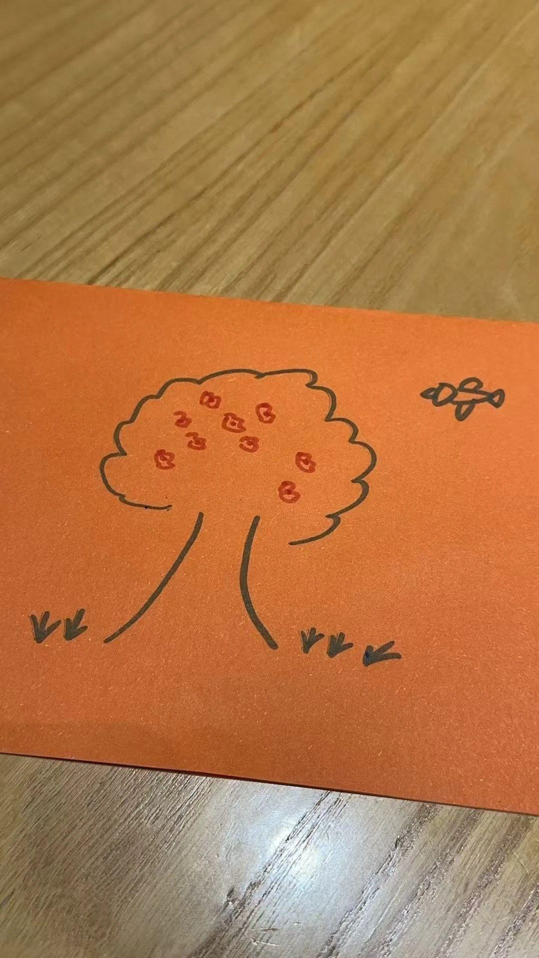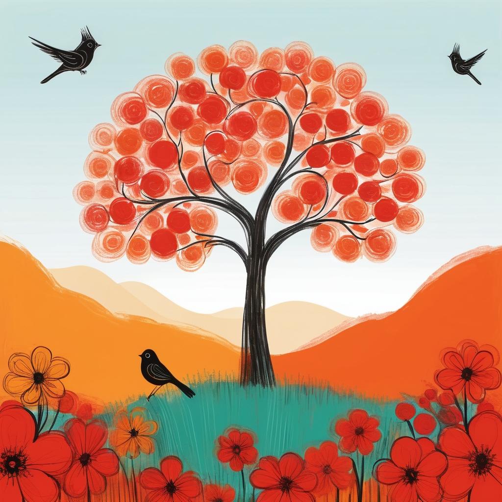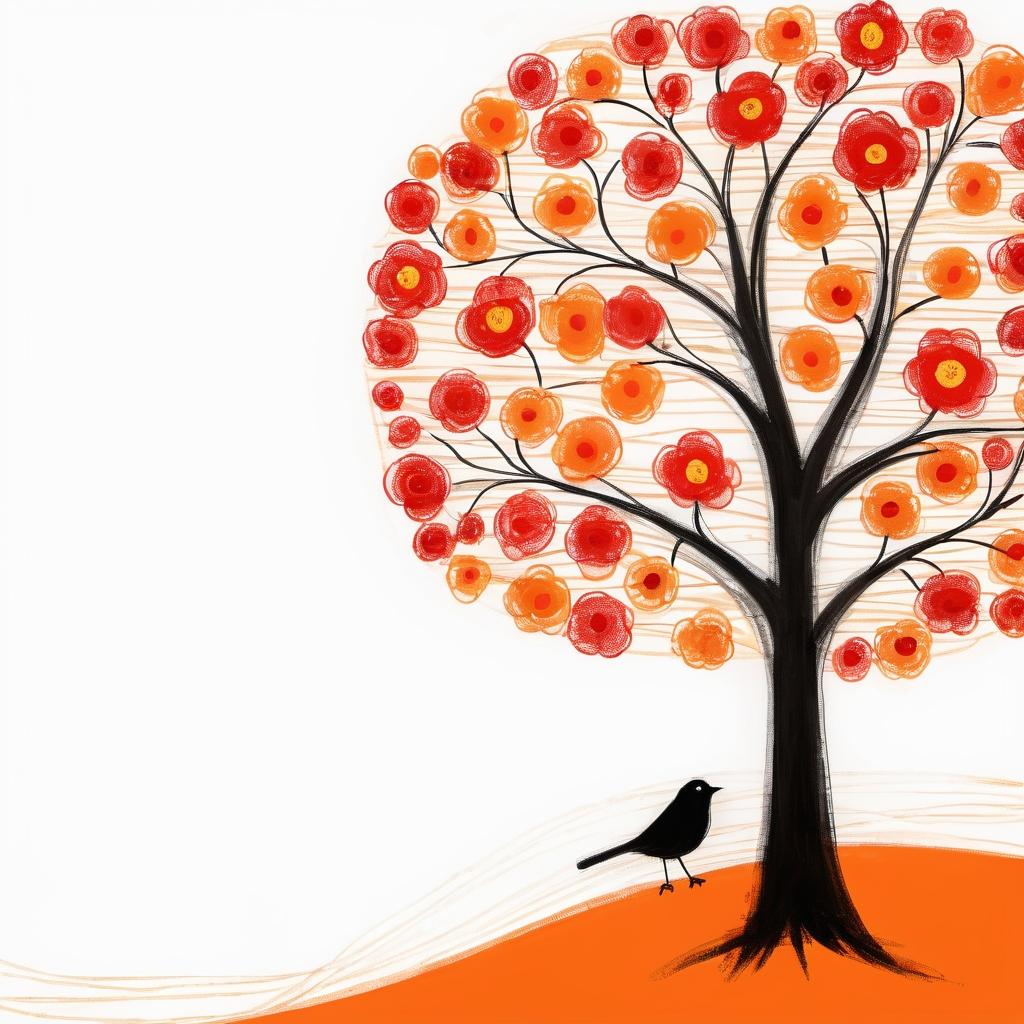 图片展示了一幅简单的手绘作品,主要元素包括一棵树和一只鸟,树上有几朵红色的花。背景是橙色的纸张,凸显出一种温暖和舒适的氛围。整体构图简约,线条流畅,表达了一种自然的宁静和简朴的快乐。