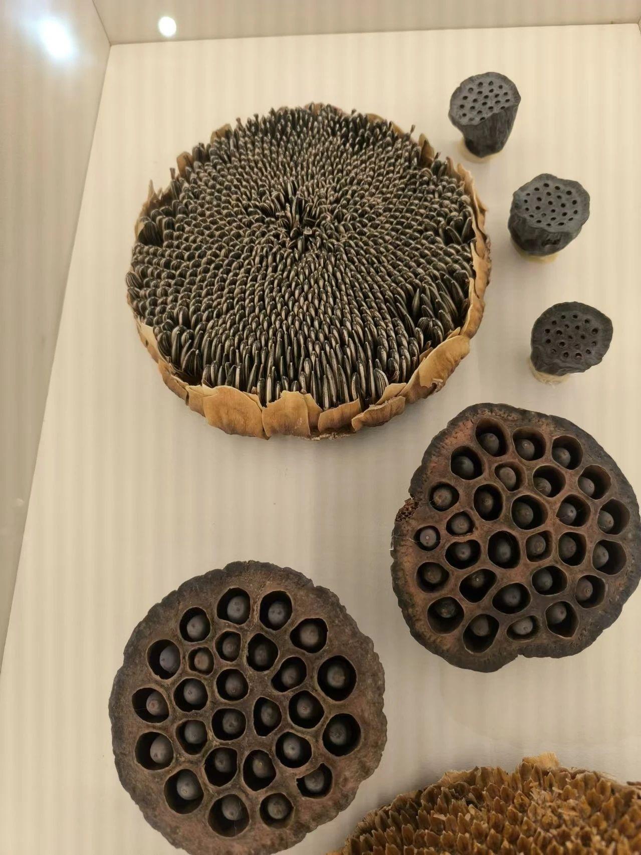 这幅图片展示了一些干燥的植物种子结构,可能是向日葵和莲蓬。整体颜色为自然的棕色和灰色,构图简洁,呈现出自然界的几何美感。图片可能试图传达自然之美和生命的循环。
