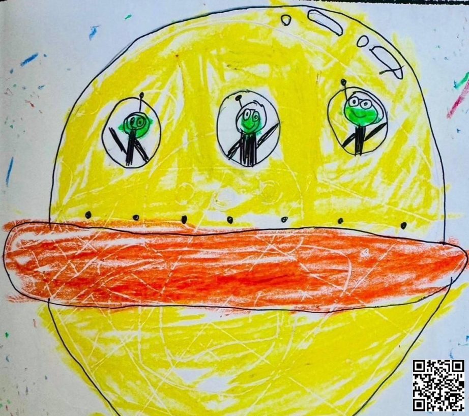 这幅作品展示了一艘黄色的飞船,船上有三个绿色的小外星人。画面使用了明亮的黄色和橙色,营造出一种愉快和童趣的氛围。每个外星人都在窗户中微笑,散发出友好的情感。整体构图简单而有趣,表达了孩子对外太空的想象和好奇。