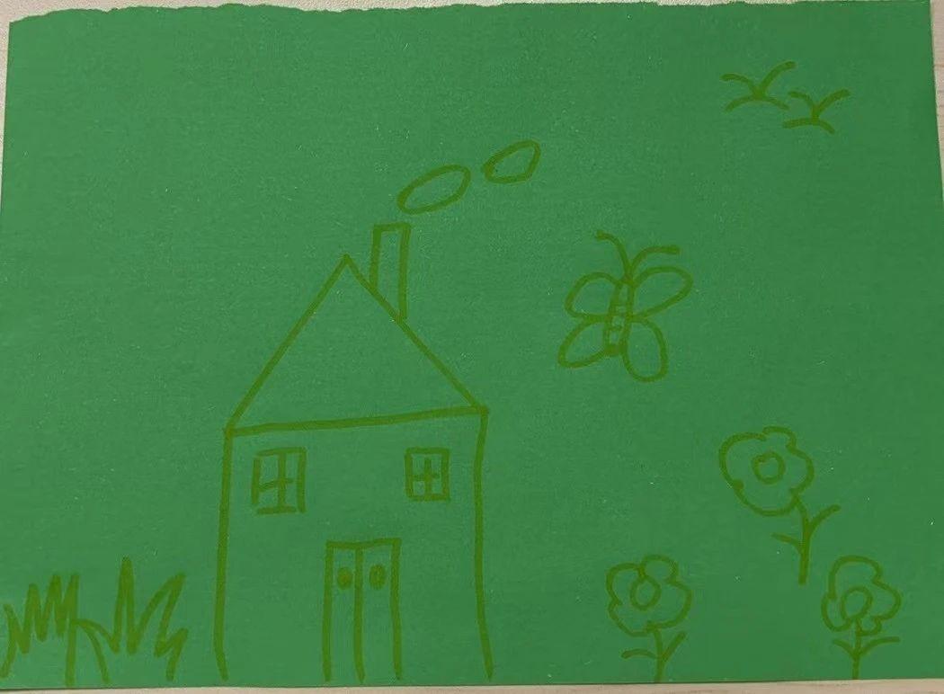 这幅图画展现了一座房子,旁边有几朵花、一只蝴蝶和几只小鸟,整个画面使用了绿色的基调。简单的线条和形状传达了一种纯真和自然的氛围,可能反映了创作者对自然世界的欣赏和向往。