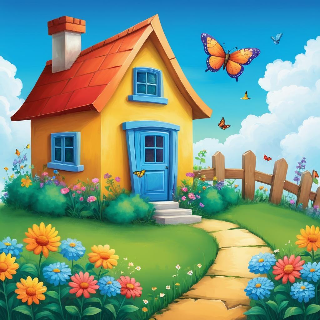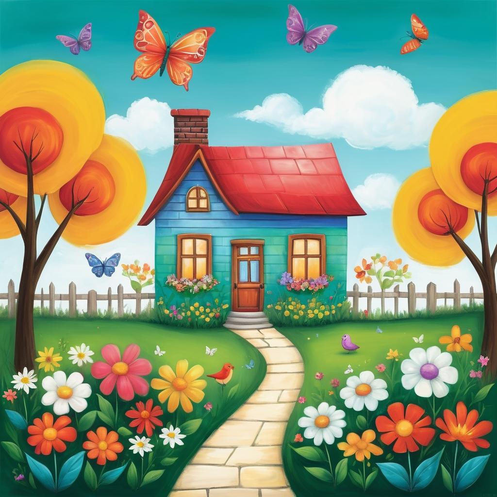 为了进一步提升作品的艺术性,可以考虑在画面中加入多样的色彩,使每个元素更具独特性。例如,使用明亮的颜色来区分花朵、蝴蝶和房子,增强视觉的层次感。同时,添加细节如花瓣的纹理、蝴蝶翅膀的斑纹,以及天空的渐变色调,可以为作品增添深度和表现力。