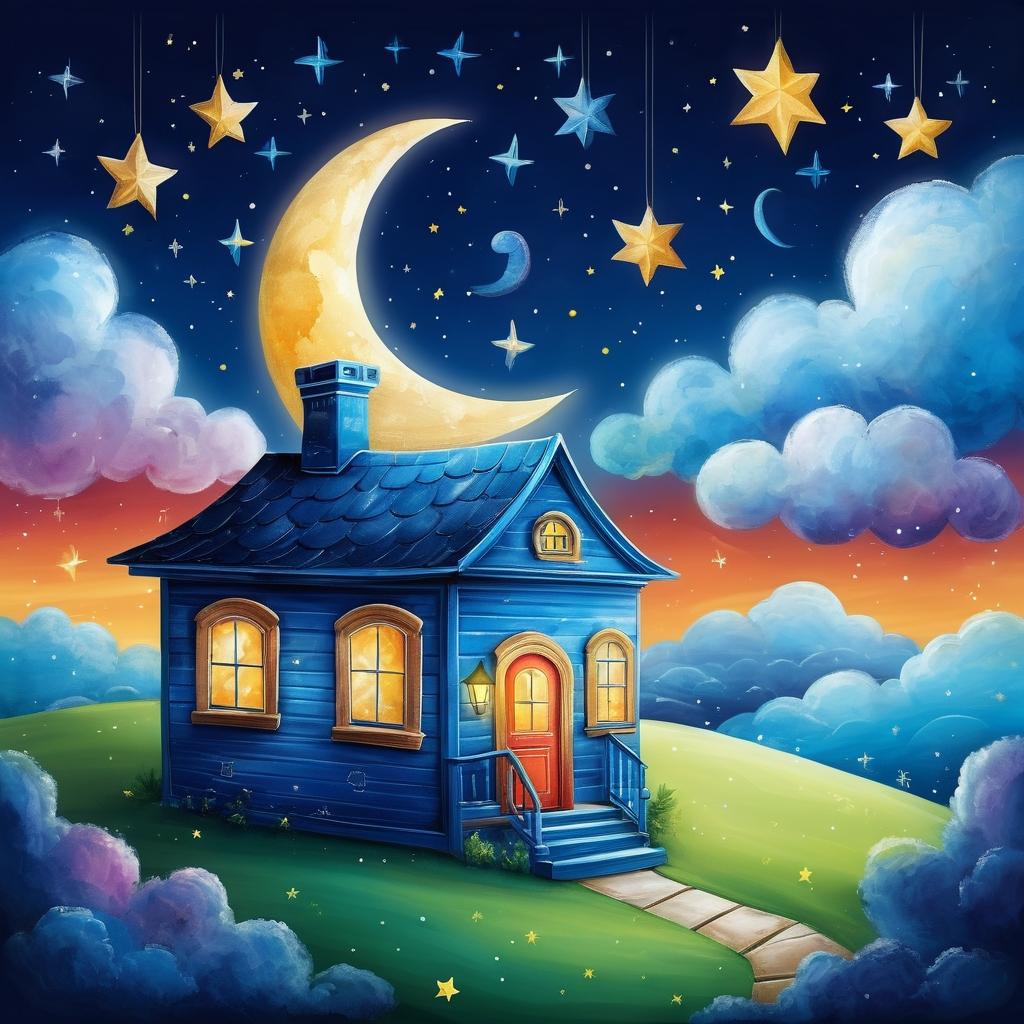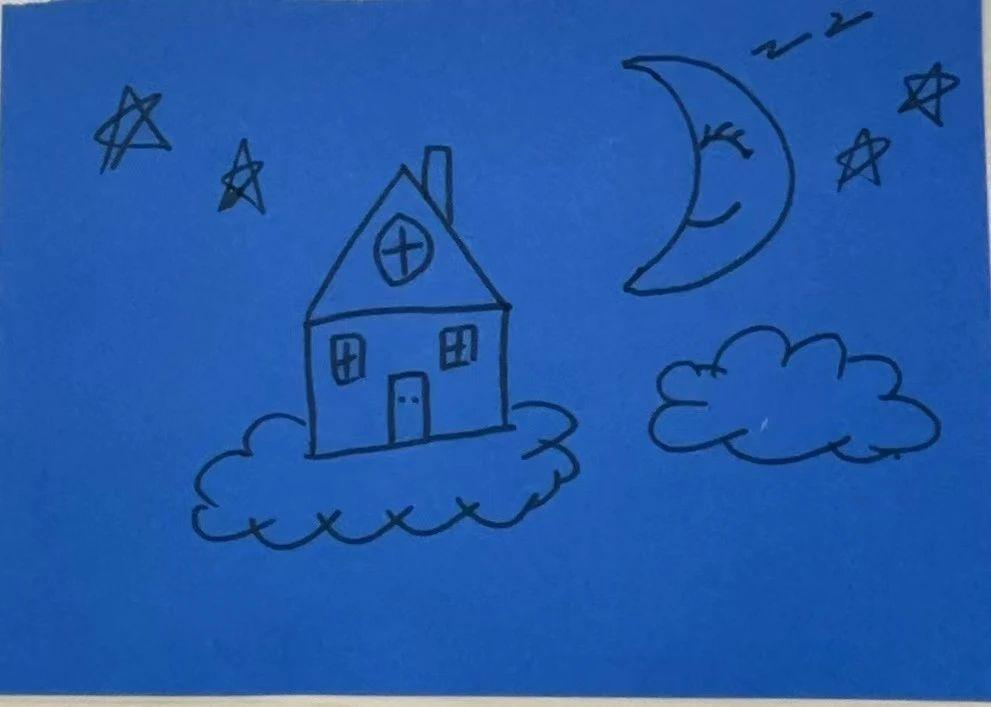这幅画使用了简单的线条和单一的蓝色背景,描绘了一座房子漂浮在云上,伴随有月亮和星星,展现了一种梦幻和宁静的氛围。创作者可能试图表达一种童话般的幻想世界,营造出一种温馨的夜晚场景。