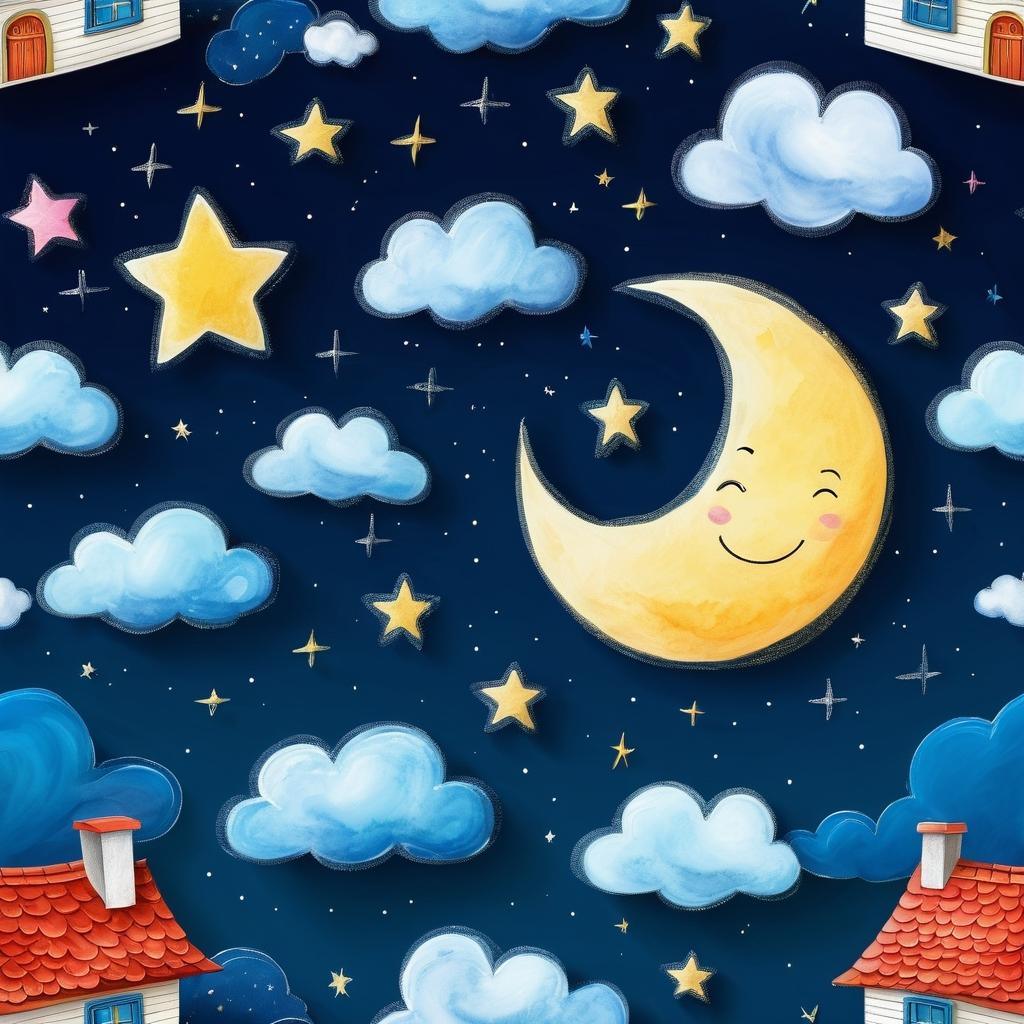 这幅作品以其简单而富有童趣的风格,成功地传达了梦幻般的氛围。为了提升这幅画的艺术深度,可以尝试在色彩上进行更多的探索,例如通过渐变色来增加天空的层次感,使得夜空显得更加深邃。同时,可以在云朵上增加一些细节,譬如微弱的星光反射,来丰富图像的质感。在构图上,可以考虑增加一些小动物或树木,这样能使整个画面更具故事性。通过这些调整,画作可以更好地引导观众进入一个奇幻的世界,唤起更多的想象力和情感共鸣。