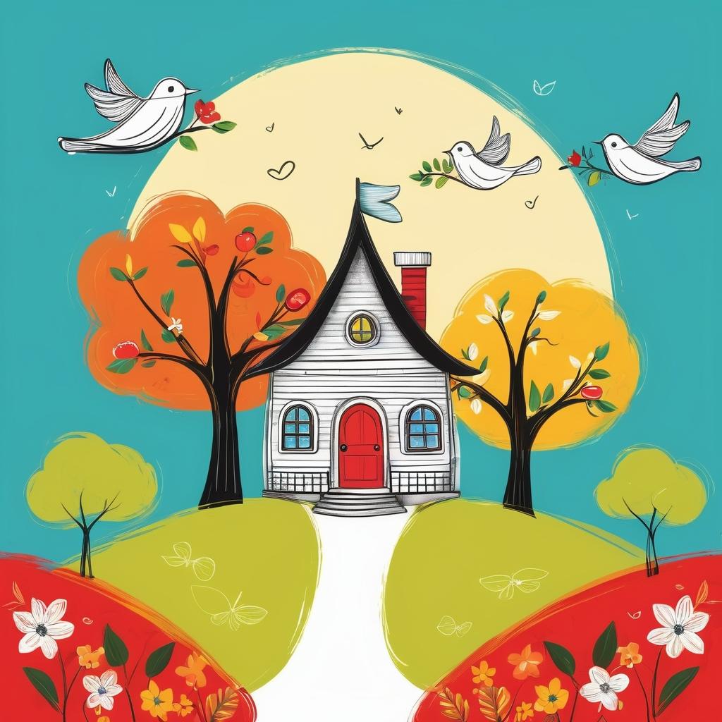 这幅作品具有鲜明的儿童画风格,采用简单的线条和色块。主要元素包括一个苹果形状的房子,周围环绕着树木、花朵和飞鸟。明亮的黄色背景营造出一种快乐和充满活力的氛围,红色线条则使图像更加生动。整体构图简单而富有童趣,传达了自然和家园的主题。
