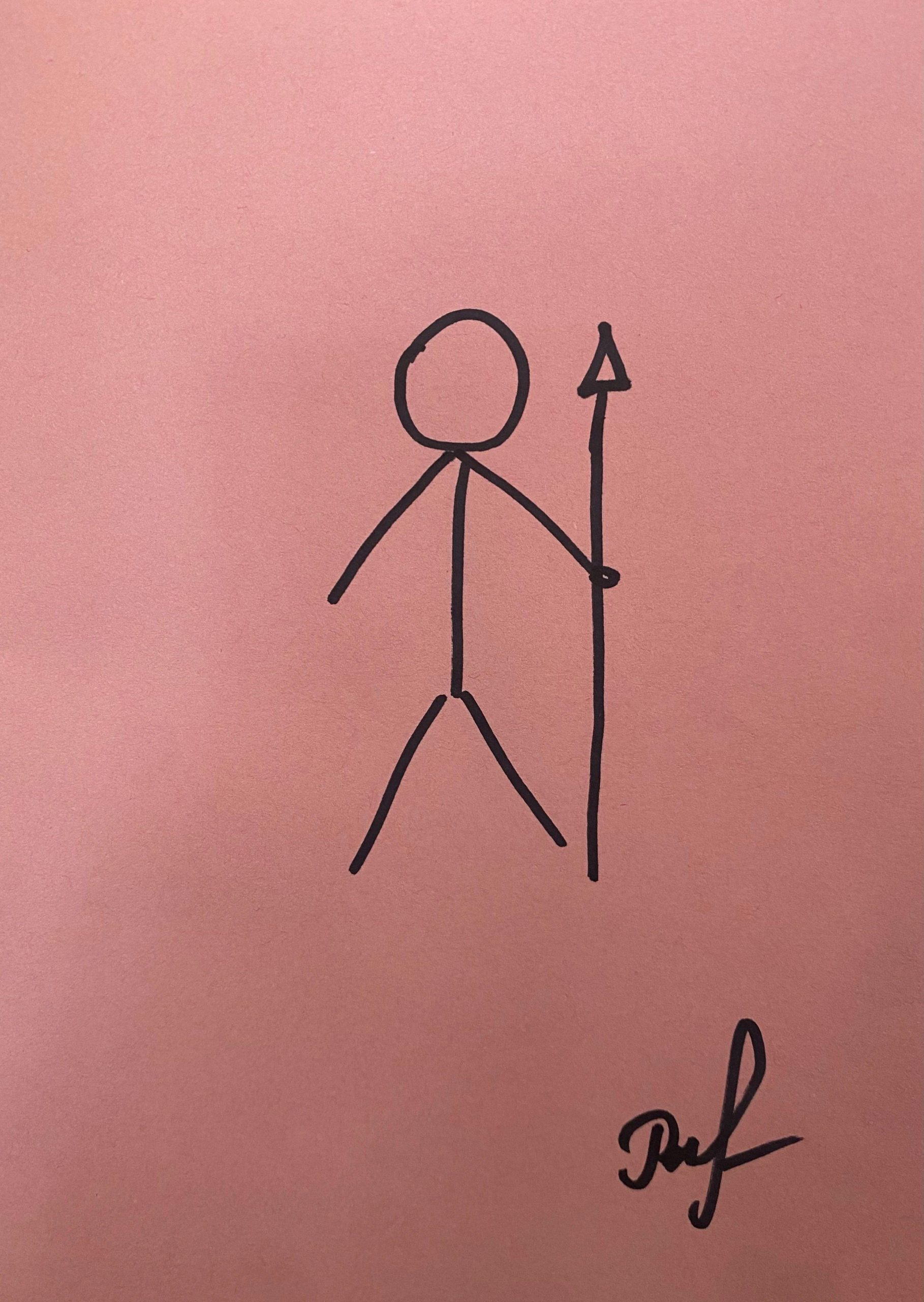 这幅图呈现了一个简单的线条人像,背景为粉红色。人物手持长矛,呈现出一种原始或部落的感觉。作品以极简主义风格为主,强调了线条的简洁和直接。