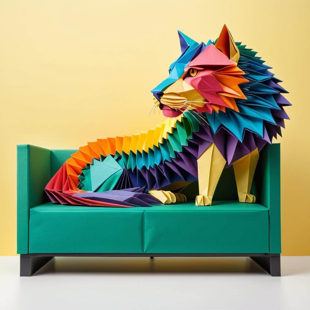 折纸艺术是一种将纸张折叠成各种形状和图案的创作形式,深受儿童和成人的喜爱。这幅作品中的折纸动物,包括猫、鳄鱼、猫头鹰和狮子等,展现了创作者的手工技巧和无限创意。每个动物都栩栩如生,色彩鲜艳,吸引着观众的目光。创作者通过简单的折纸技术,赋予了平凡纸张以生命力和故事性,激发了观众的想象力。