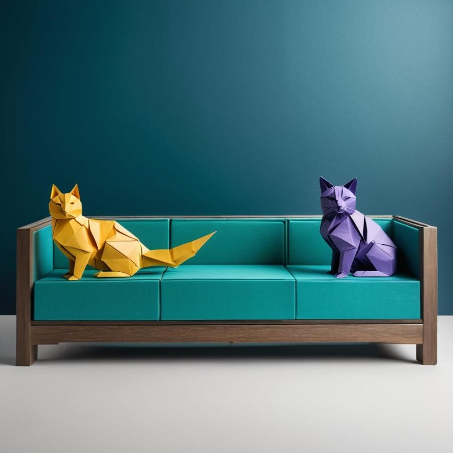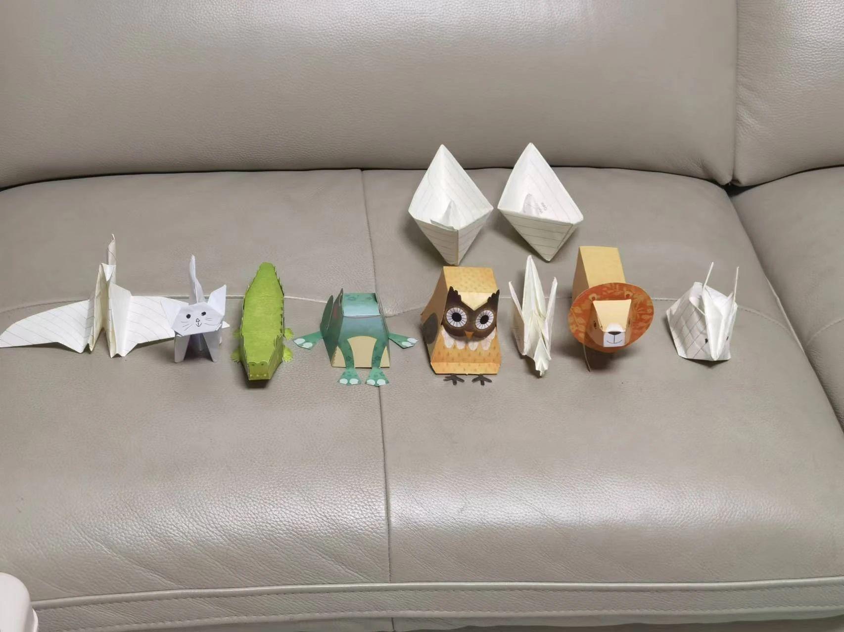 这幅作品展示了一组手工折纸动物,它们被整齐地排列在沙发上。主要元素包括多种颜色和形状的动物折纸,如猫、鳄鱼、猫头鹰、狮子等。作品传达了一种童趣和创意,体现了创作者对折纸艺术的热爱以及对动物形象的细致刻画。