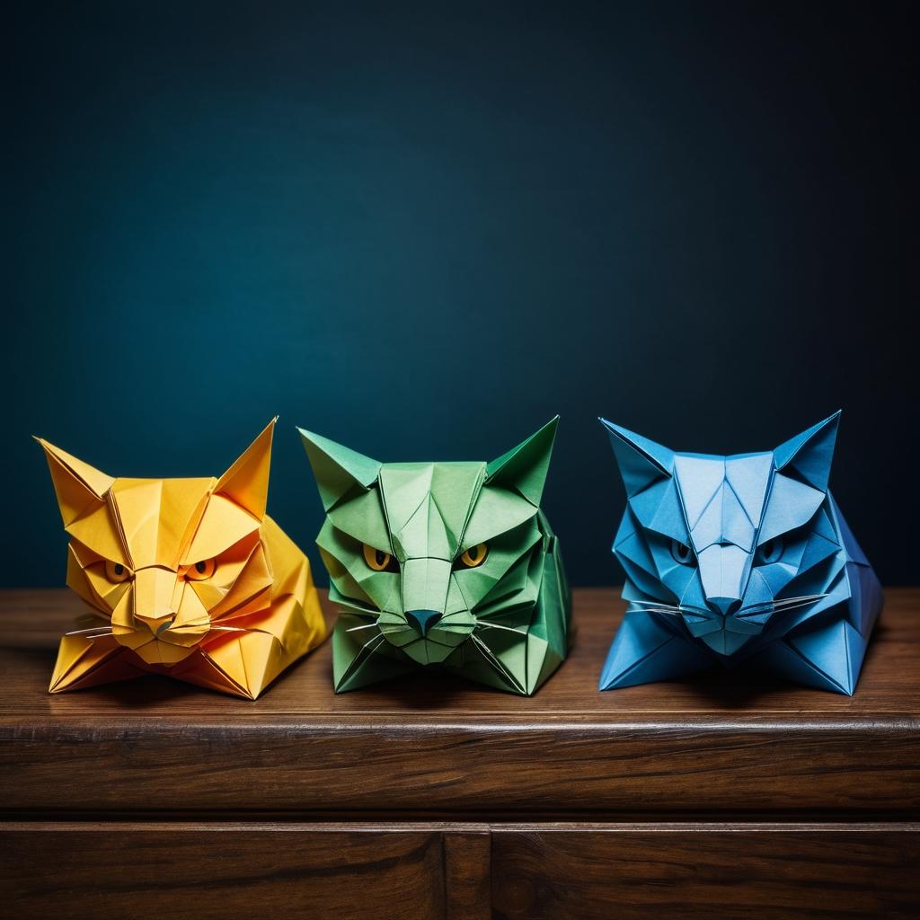 折纸艺术是一种将纸张折叠成各种形状和图案的创作形式,深受儿童和成人的喜爱。这幅作品中的折纸动物,包括猫、鳄鱼、猫头鹰和狮子等,展现了创作者的手工技巧和无限创意。每个动物都栩栩如生,色彩鲜艳,吸引着观众的目光。创作者通过简单的折纸技术,赋予了平凡纸张以生命力和故事性,激发了观众的想象力。