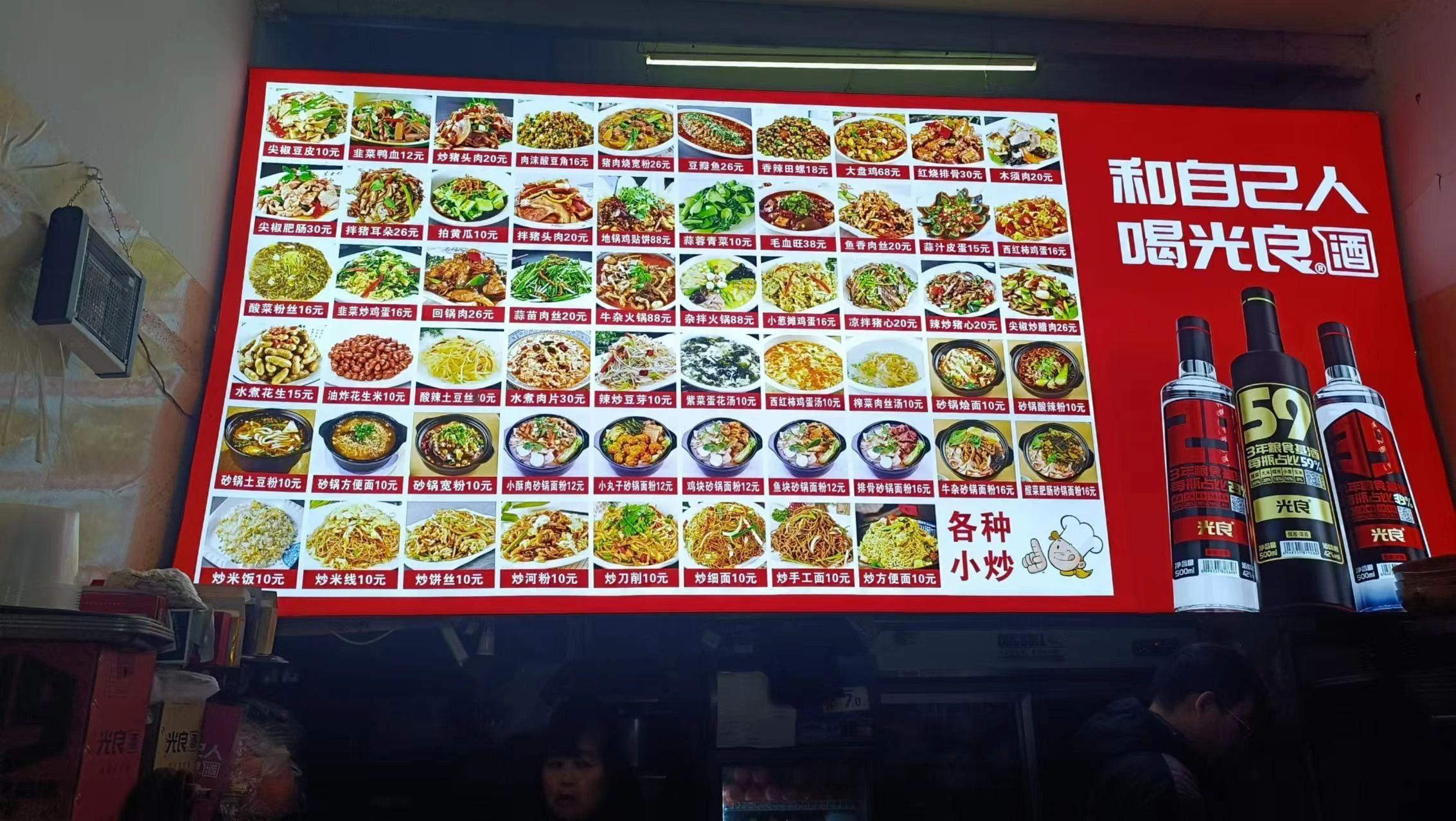 这幅图像展示了一个餐馆的菜单广告牌,上面有各种各样的中式菜肴图片和价格。菜单的设计色彩鲜艳,主要使用红色背景和白色文字,旨在吸引顾客的注意力。右侧还有一则酒类广告,整体传达出一种浓厚的本土饮食文化氛围。