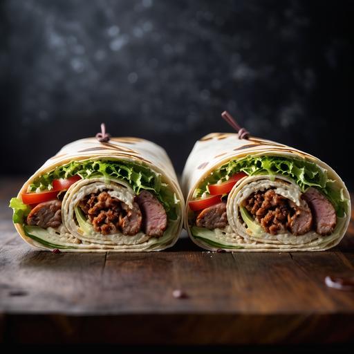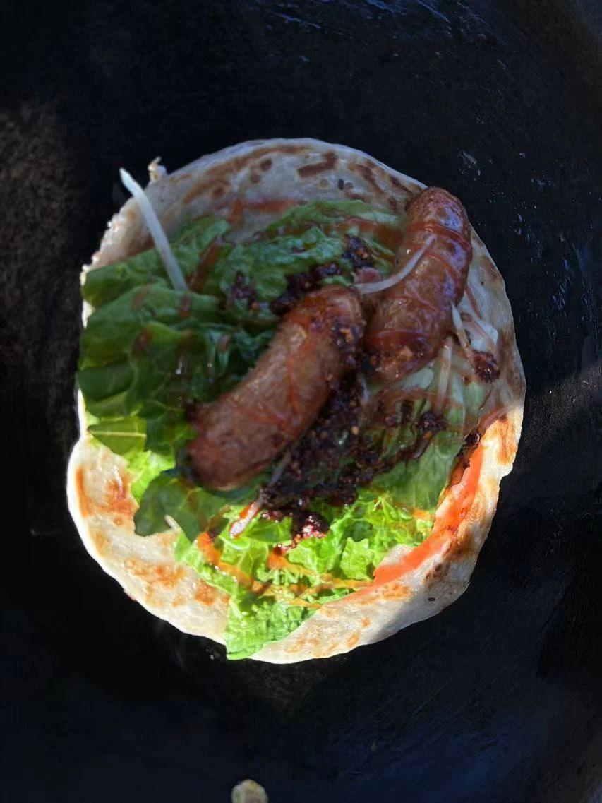 这幅作品展示了一种美食,主要元素包括面饼、绿色的生菜、香肠和酱料。色彩上以绿色和棕色为主,呈现出一种自然和诱人的视觉效果。构图上,食物被放置在画面的中央,突出其主体地位。情感上,这幅作品传达了一种温暖和满足感,可能意在唤起观者的食欲和对美食的热爱。
