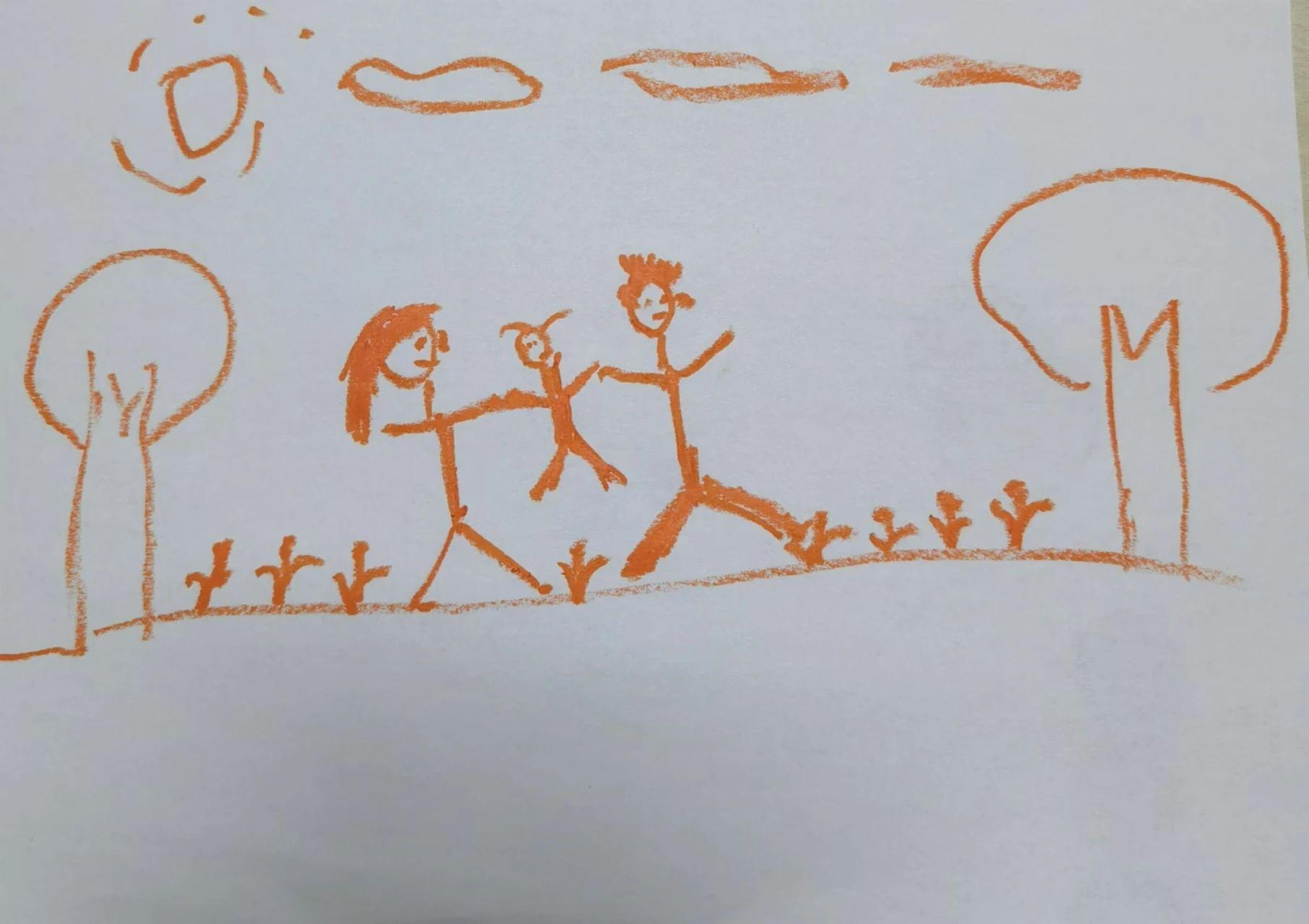 这幅图主要使用了橙色蜡笔进行绘制,描绘了一幅家庭场景。画面中有三个人物,似乎是一对父母和一个孩子,他们在阳光下的草地上嬉戏。简约的线条和图形表现出一种天真无邪的童趣风格。背景中有太阳、云朵和两棵树,构图简单且富有稚趣。