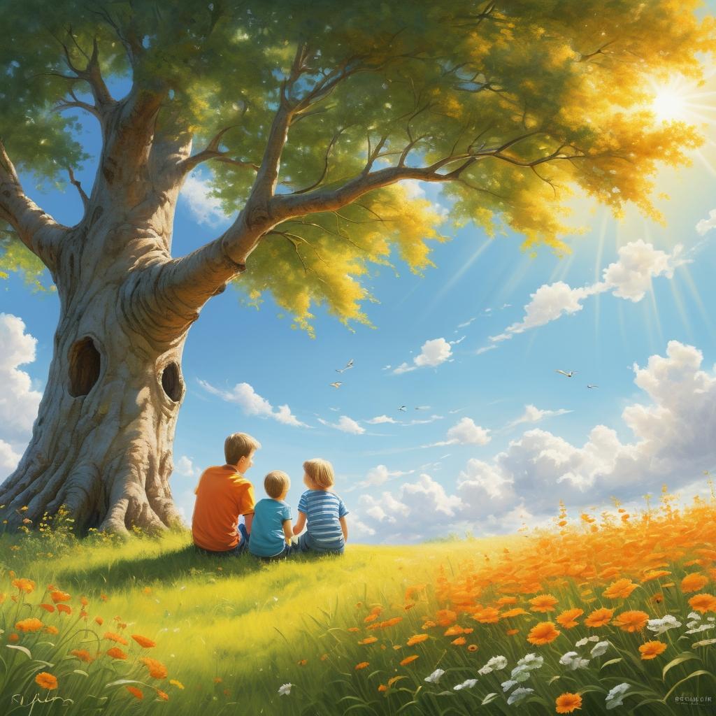 这幅作品通过简单的线条和鲜明的色彩,传达了一种纯粹的快乐和家庭的温暖。为了提升作品的艺术深度,可以考虑增加背景的细节,例如更多形态各异的植物或动态的云彩,以丰富故事的背景。通过多层次的色彩运用,可以增加视觉的层次感。此外,考虑在人物面部表情和肢体动作上增加细节,能够更好地传达出互动的情感和家庭的温馨。