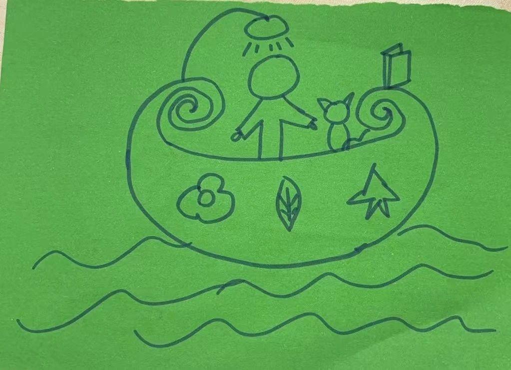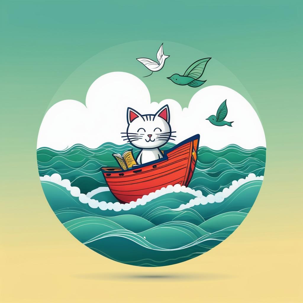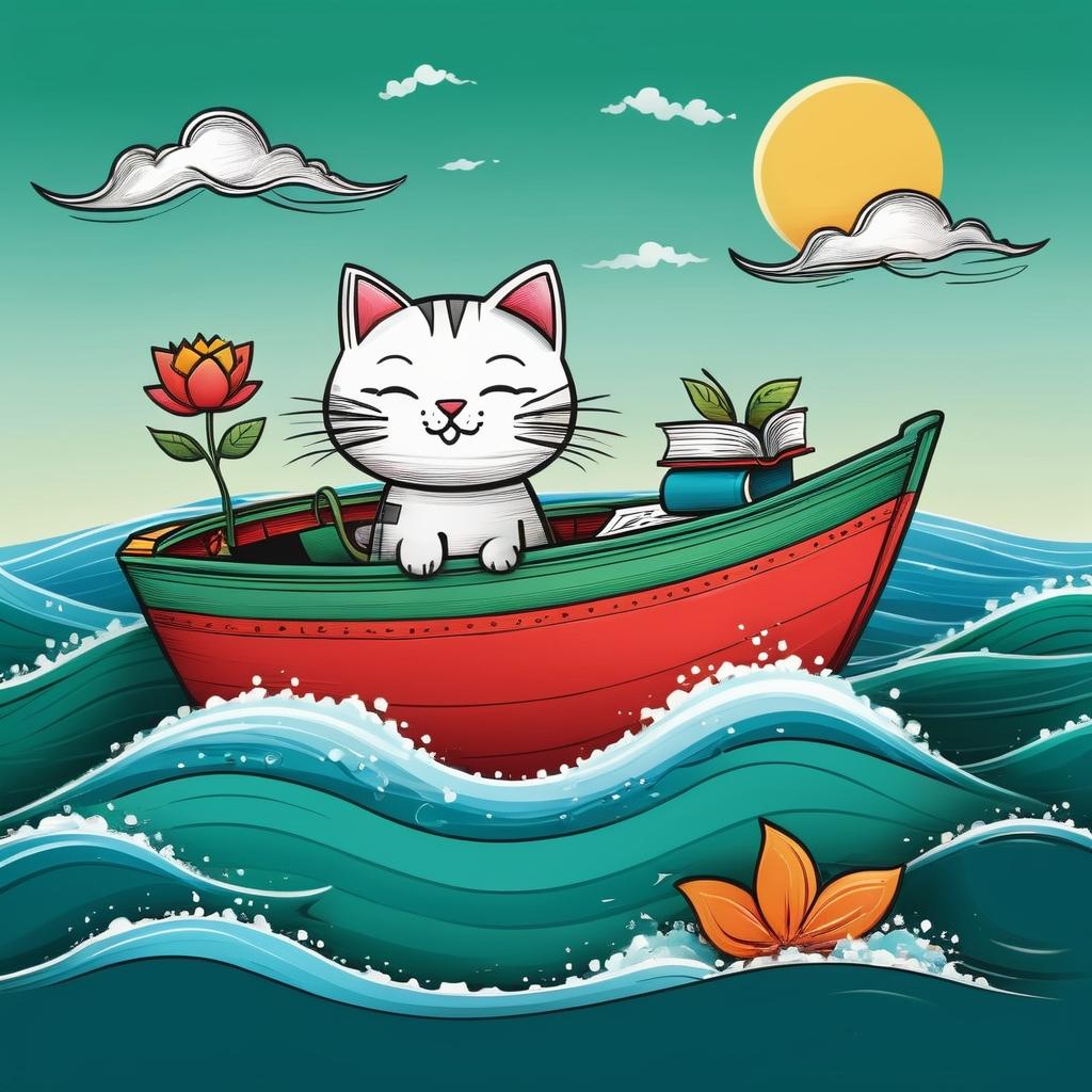 在这幅充满童趣的插画中,创作者以简洁的线条和符号,勾勒出一个人物与猫咪在海上航行的场景。绿色的背景不仅让人感受到宁静,也赋予了画面一种自然的氛围。船上的花、叶子和书的图案,暗示了大自然的美好和知识的力量。通过这些元素,作品传递出一种探索与发现的乐趣。