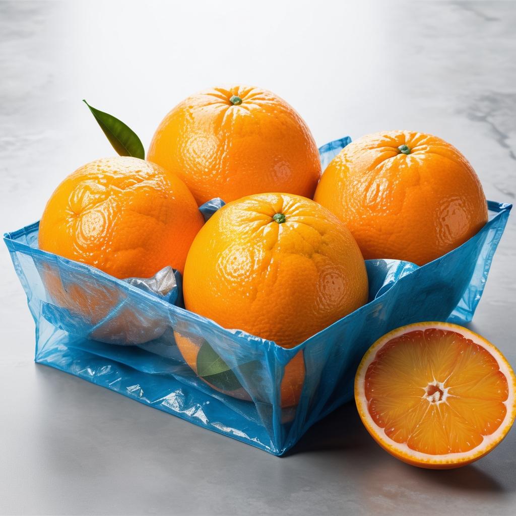 该作品呈现了一组橘子,鲜艳的橙黄色调充满了画面。橘子表面纹理清晰,背景中透明塑料袋和绿色植物叶子的细节增加了生活气息。整体构图简单,重点在于水果的自然美感和色彩对比。