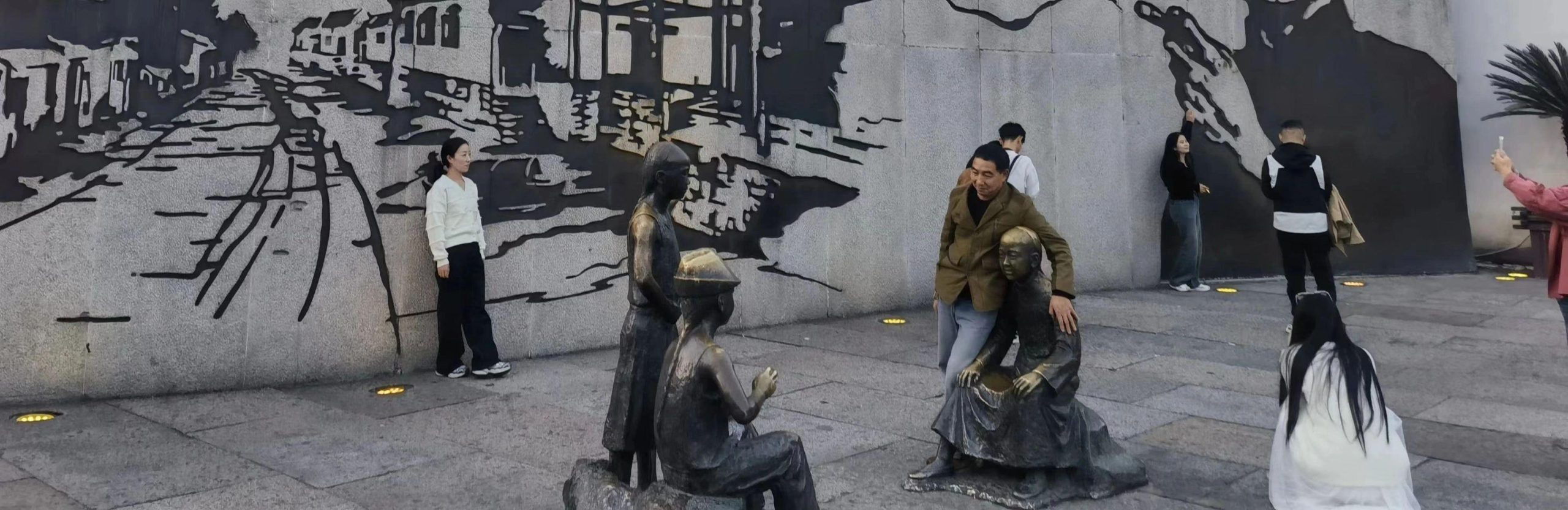 这幅公共艺术作品巧妙地融合了雕塑和壁画,展现了历史与现代的交织。雕塑中的人物姿态自然,面部表情宁静,仿佛在诉说着过去的故事。与之相对的是简约的城市壁画,通过简单的线条描绘出城市的轮廓,背景与雕塑形成鲜明对比。这种对比不仅增强了作品的视觉冲击力,也为观众提供了丰富的想象空间。