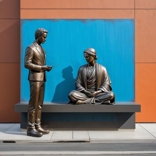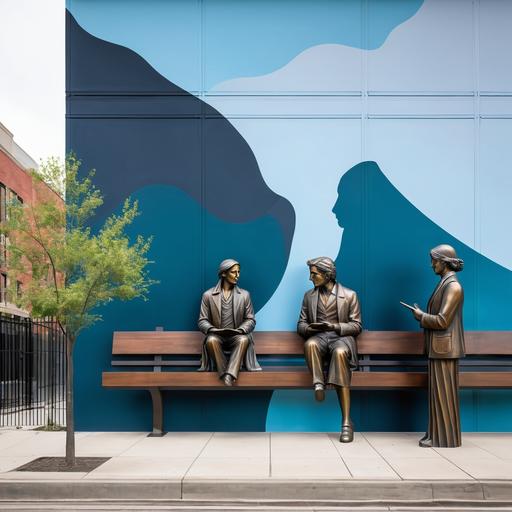这幅作品展现了一个带有现代雕塑和壁画的公共空间。雕塑人物表现出一种静谧和历史感,背景壁画则描绘了一个城市的街景,可能意在传达出一种历史与现代交融的主题。整体色调偏冷,给人一种稳重和思考的氛围。