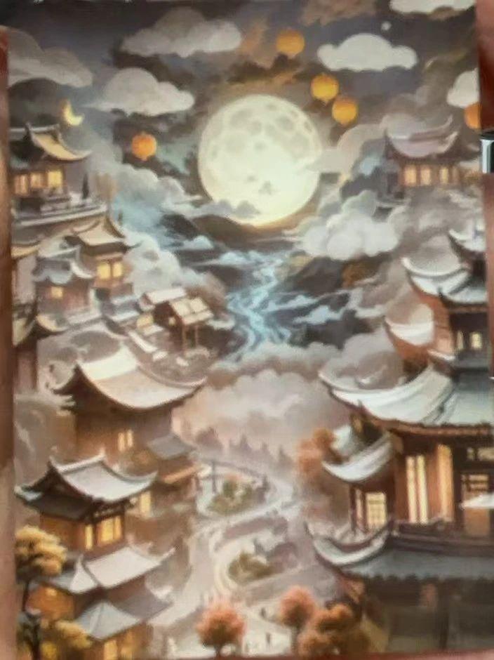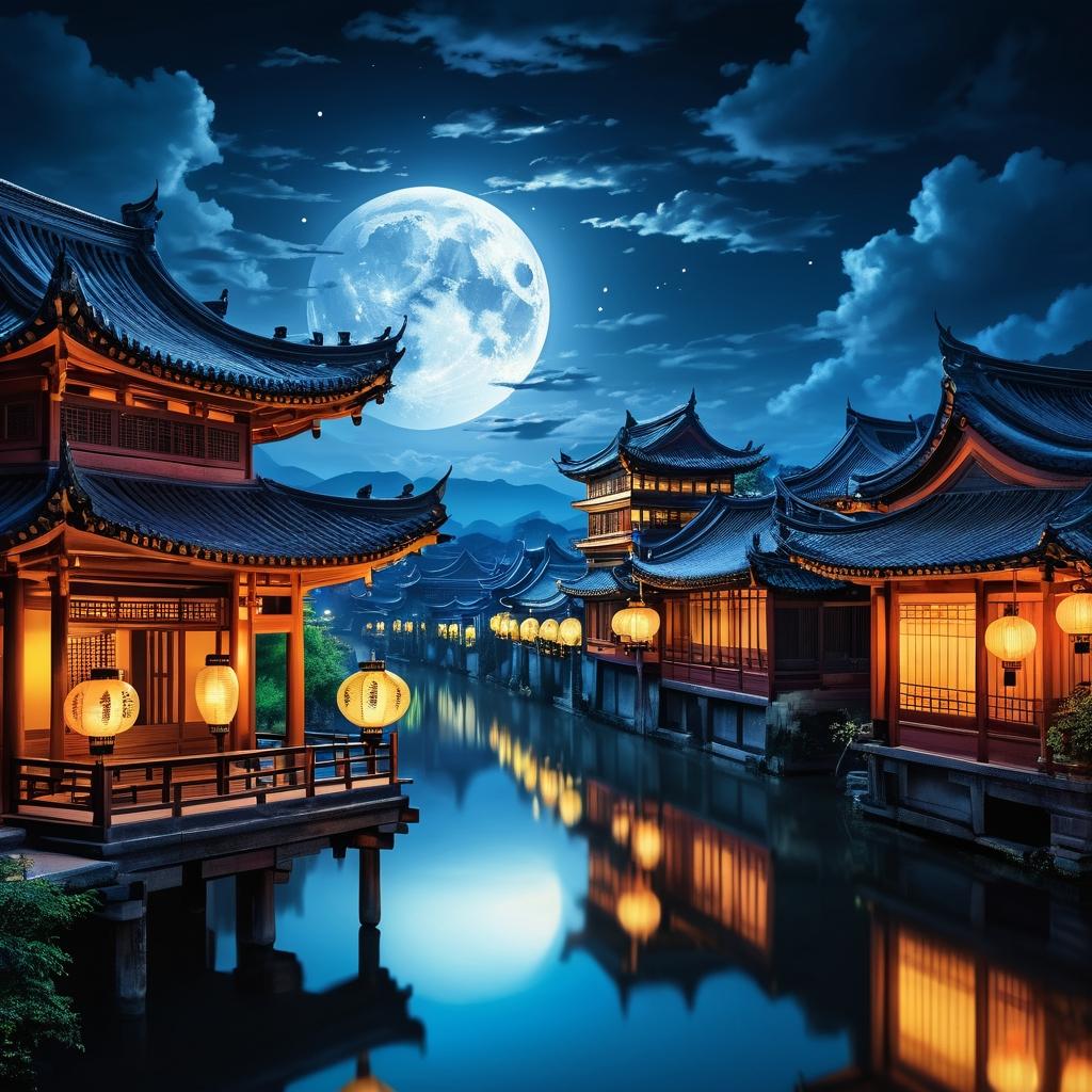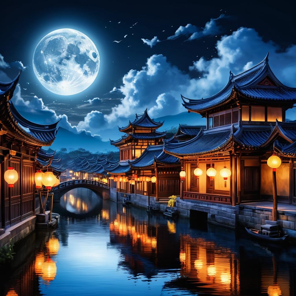 这幅作品展现了一个古代东方城镇的夜景,月亮高挂在天空,周围是漂浮的云朵和灯笼。建筑物的屋檐错落有致,背景是蜿蜒的河流。画面整体呈现出一种宁静而梦幻的氛围,给人一种穿越时空的感觉。色调柔和,灯光从窗户中透出,增加了温暖感。