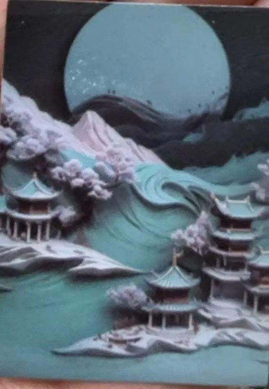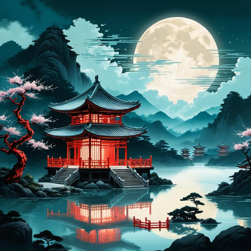 这幅画呈现了一种梦幻般的山水景色,画面中有几座传统的中式凉亭,背景是一轮巨大的圆月。色调以青绿色为主,给人一种宁静和神秘的感觉。山峦和波浪状的云层增添了画面的动感,似乎在传达一种和谐与自然之美的主题。