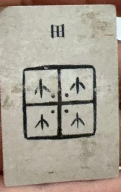 这幅作品呈现出一个简单且富有象征意义的图案。四个相同的符号被均匀地分布在一个正方形的四个部分中,背景是朴素的灰色。这个设计可能传达了一种和谐、平衡的主题,符号本身可能具有某种文化或历史意义。