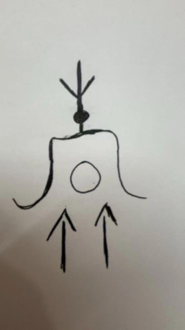 这幅作品采用简单的线条与形状构成,中心是一个类似面具或人脸的图形,头顶有箭头,底部有两个向上的箭头。整体呈现一种神秘且抽象的风格,可能在探索人类与自然、力量或方向感的关系。
