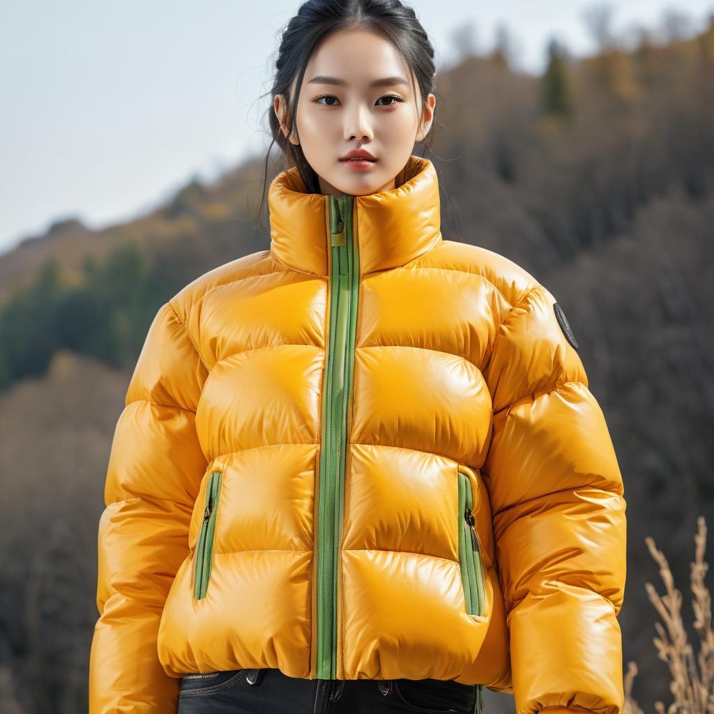 灵感来源于黄沙柑的金黄色调与自然纹理。设计一款羽绒服,采用金黄色作为主色调,象征着温暖和丰收。面料选择上,可考虑使用具有自然纹理的面料,以呼应水果表皮的质感。剪裁上,可以引入水果的圆润形状,增添服装的立体感和舒适性。在细节上,点缀绿色元素,灵感来自背景的植物,使设计更具生命力。最终设计将由真人模特展示,突显羽绒服的温暖与自然气息。