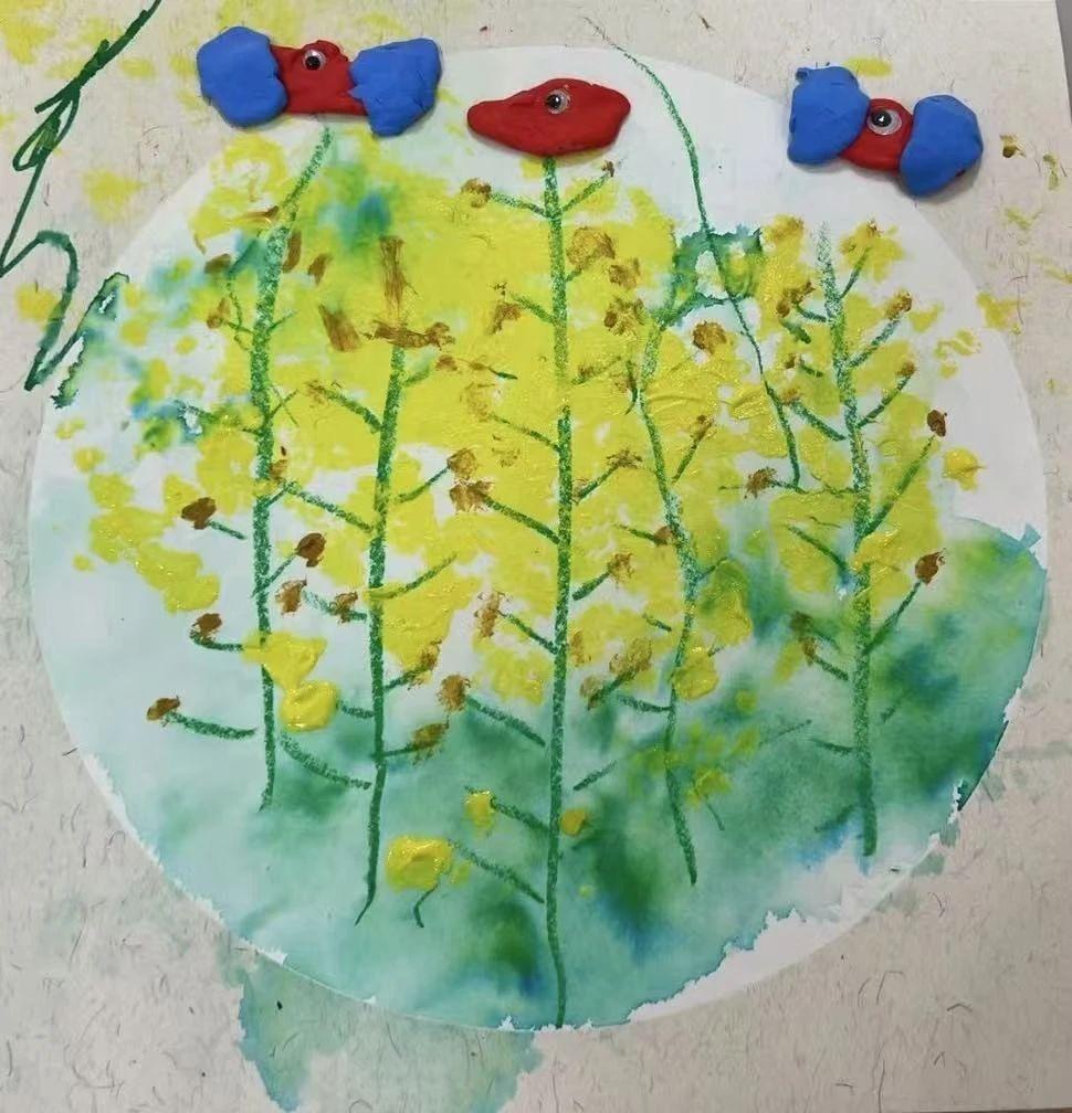 这幅作品采用了色彩丰富且大胆的表现手法,主要以黄色和绿色的植物为主体,具有强烈的自然气息。上方的红色和蓝色粘土元素增添了趣味性和立体感,仿佛是抽象的昆虫或花朵,给人以童真和创造力的启发。整体构图简单而富有动感,充满生机与活力。