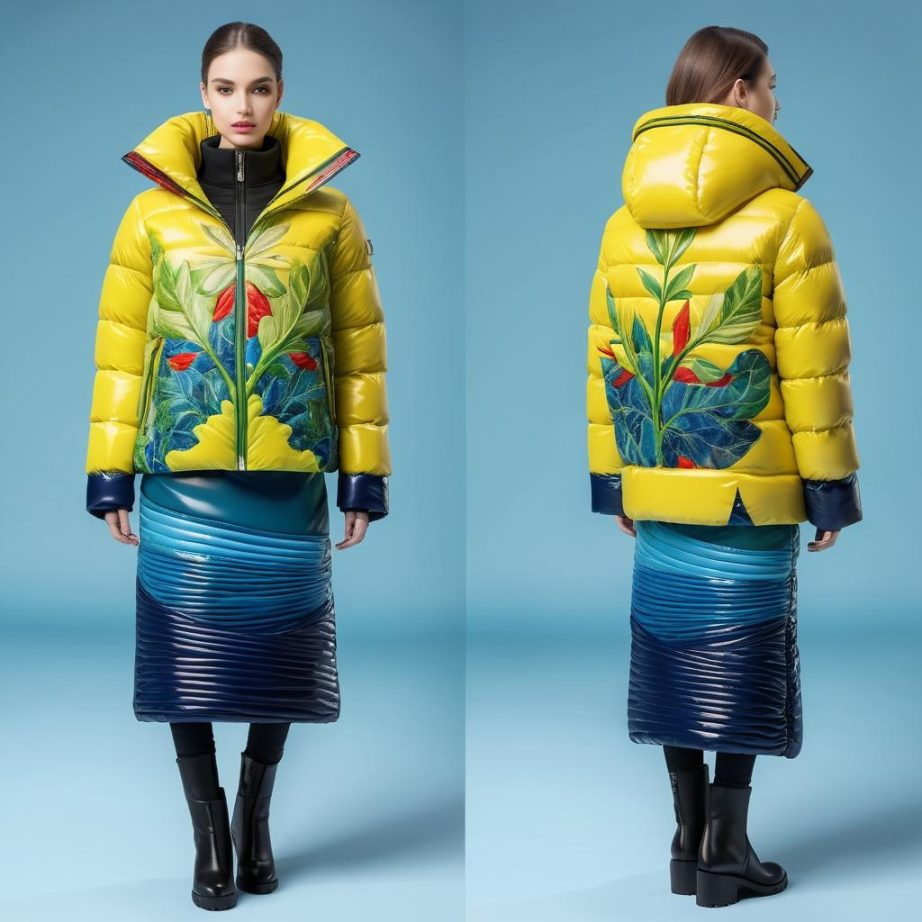 这幅作品通过丰富的色彩和抽象的自然元素,激发了羽绒服设计的无限可能。黄色和绿色的植物形态象征着生命力,成为设计中的核心灵感来源。羽绒服可以通过印花技术,将这些色彩和形状表现得淋漓尽致。红色和蓝色的粘土元素则为设计增添了现代感和趣味性,可以巧妙地应用在细节设计中,如拉链或袖口。通过对色彩和材料的精心选择,设计师将自然的生机转化为时尚的表达,使穿着者感受到来自自然的温暖和活力。这样的设计不仅仅是对视觉的享受,更是一种文化和情感的传达。