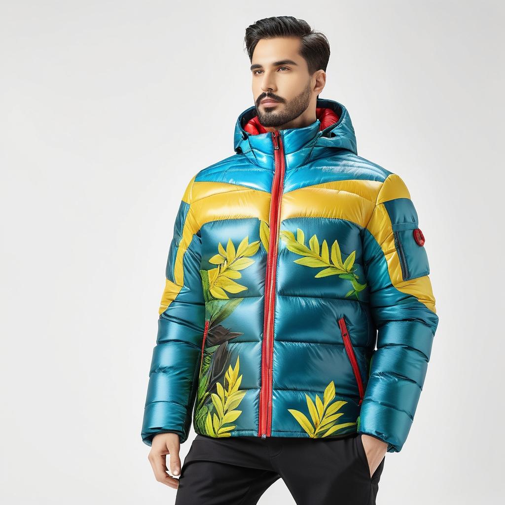 这幅作品的色彩运用和自然元素为羽绒服设计提供了丰富的灵感。可以将黄色和绿色的植物形态转化为羽绒服上的印花图案,运用流畅的线条和明亮的色彩来传达出自然的生机。红色和蓝色的粘土元素可以作为设计中的点缀色,应用在羽绒服的拉链或口袋细节上,增加趣味性和视觉层次感。面料上可以选用具有光泽感的材料,以增强色彩的表现力,确保最终设计由真人模特展示,以体现设计的实用性和艺术性。