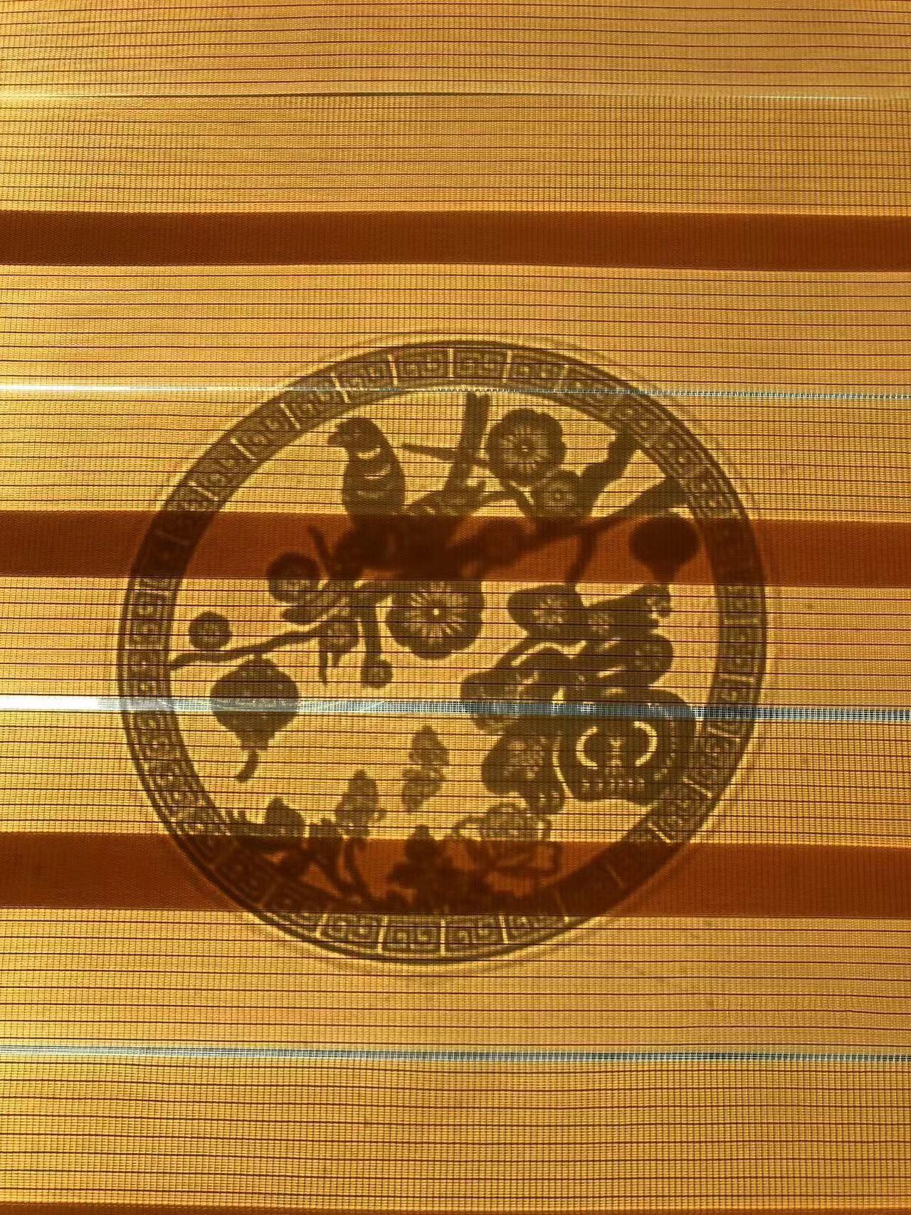 这幅作品展示了一种传统的圆形图案,可能是剪纸艺术,投射在背景上。图案中包含花卉和动物的形象,传达出自然和谐的情感。光影效果的巧妙运用使得图案的细节更加突出,背景的线条构成了微妙的对比与动态平衡。整体而言,作品蕴含了一种静谧而生动的文化叙事。