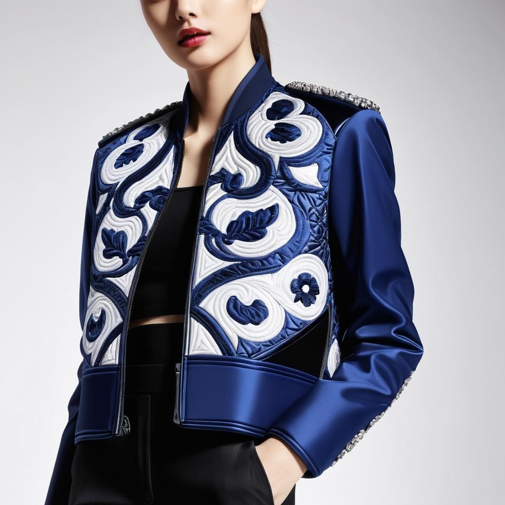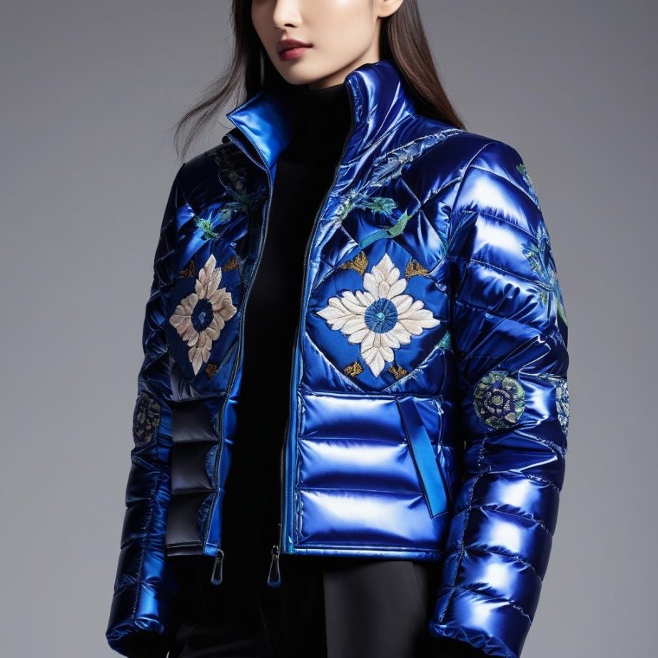 在这幅作品中,我们看到传统圆形图案与现代光影效果的完美结合。图案中的花卉和动物传达出一种自然和谐的情感,而光影的变化则为其增添了一份现代的动感。通过对这些视觉元素的深入分析,我们可以为羽绒服设计提供独特的灵感。设计师可以将这些图案元素转化为羽绒服上的刺绣或印花,利用光泽感面料捕捉光影的动态。此外,剪裁上可以采用对称设计,既保留了传统的美感,又融入现代时尚元素。通过这样的设计,羽绒服不仅是保暖的实用品,更是一件艺术作品,体现出形式与功能的完美统一。