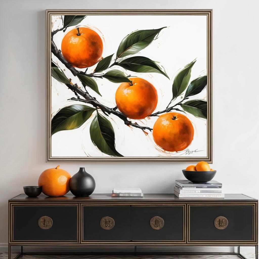 将黄沙柑的自然色彩和纹理融入到装饰画中,采用暖色调和柔和的光影对比,营造出丰收的温馨感。背景可以使用模糊的绿色植物元素,增加画面的层次感和生动性。通过细腻的笔触表现果实的质感,使画作不仅具有装饰性,还能传递自然的纯朴与生活的美好。