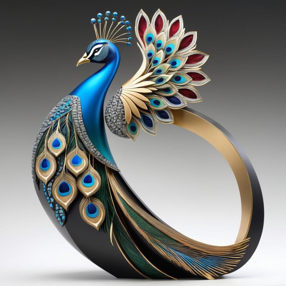 这幅作品展示了一只奢华装饰的孔雀雕塑,采用金色和多彩宝石点缀,体现出浓郁的东方文化氛围。孔雀的羽毛层次分明,呈现出丰富的细节和立体感。作品整体色彩华丽,具有很强的视觉吸引力,背景简单,突出主体。雕塑的姿态优雅,传达出高贵和自信的情感。