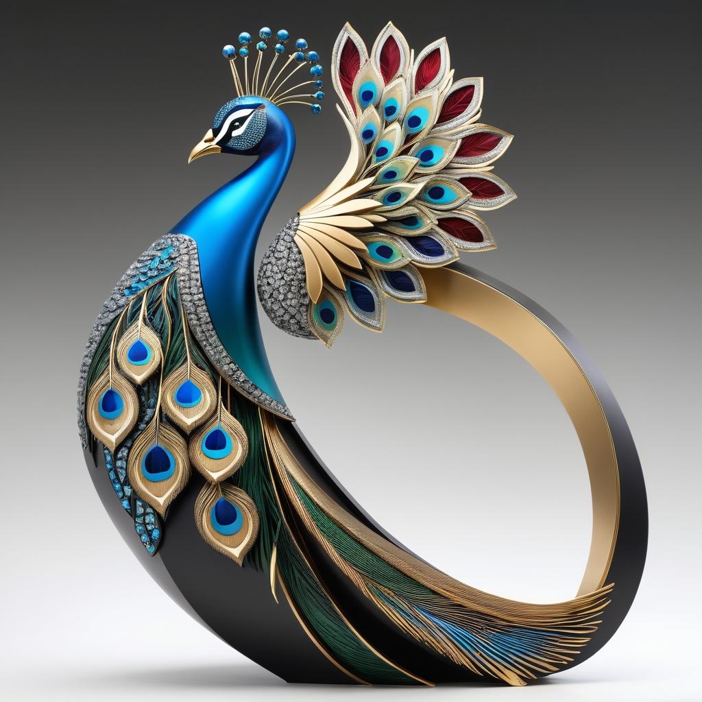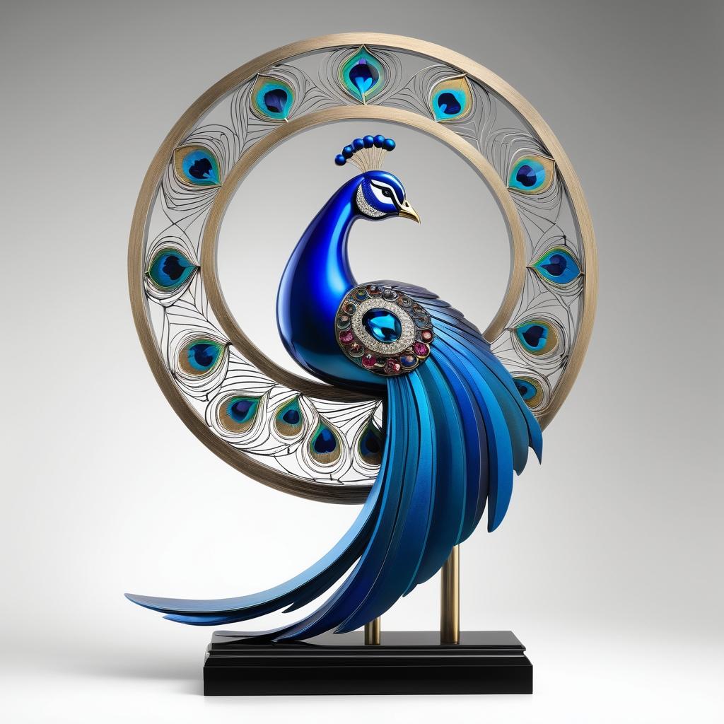 这幅孔雀雕塑以其精致的细节和丰富的色彩运用,完美地展示了奢华与文化的融合。孔雀象征着高贵与美丽,而这件作品通过金属和宝石的结合,进一步增强了这一象征。雕塑设计中,羽毛的层次感和光泽效果尤为突出,赋予作品强烈的空间感和视觉冲击力。创作者通过对传统东方元素的现代化处理,使作品在形式和情感表达上达到了高度统一。观众在欣赏这件作品时,不仅能感受到孔雀的优雅,还能体验到其背后深厚的文化内涵。这种设计理念启发了现代雕塑在传统与创新之间的平衡,为观众带来深刻的艺术体验。
