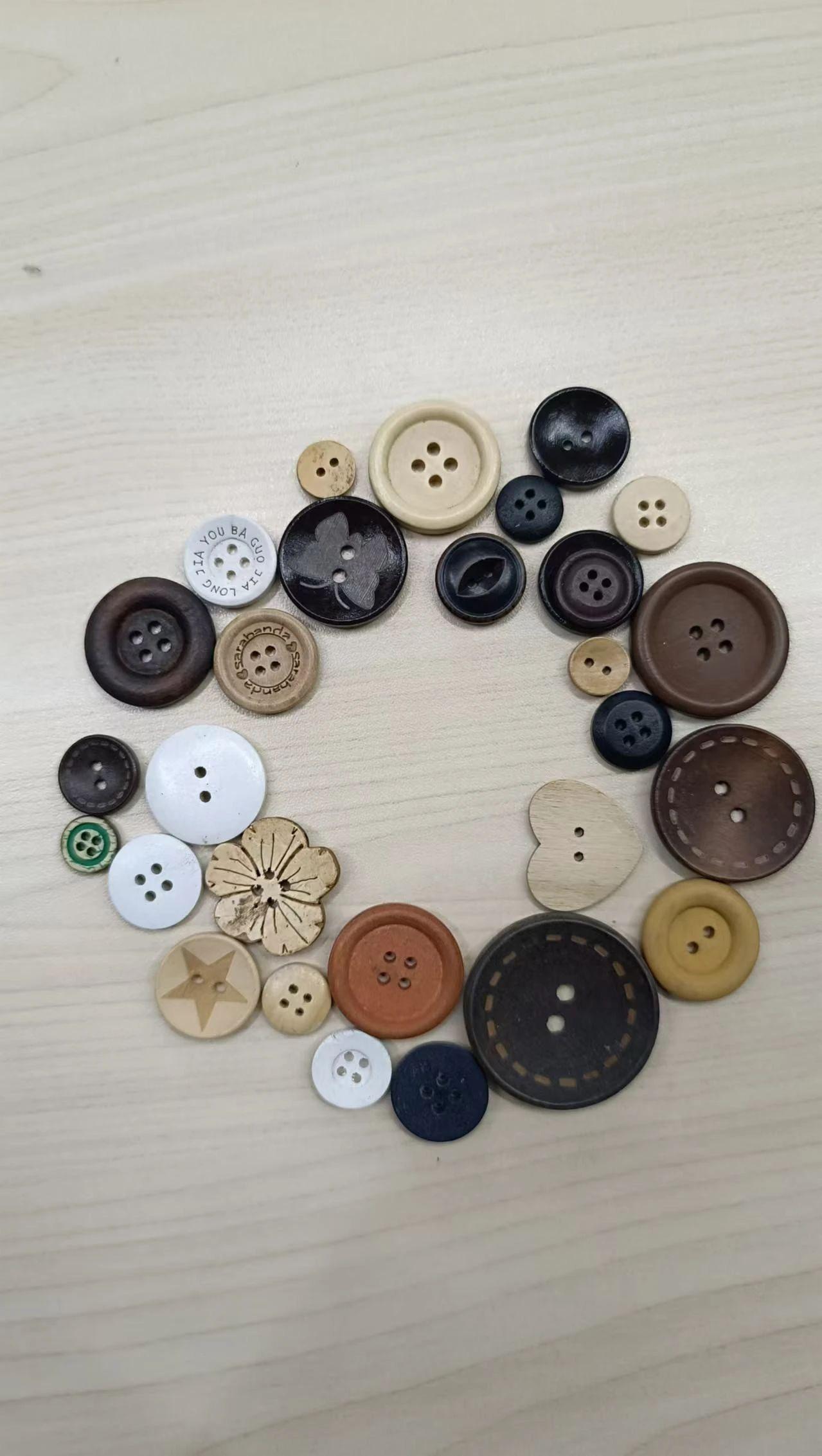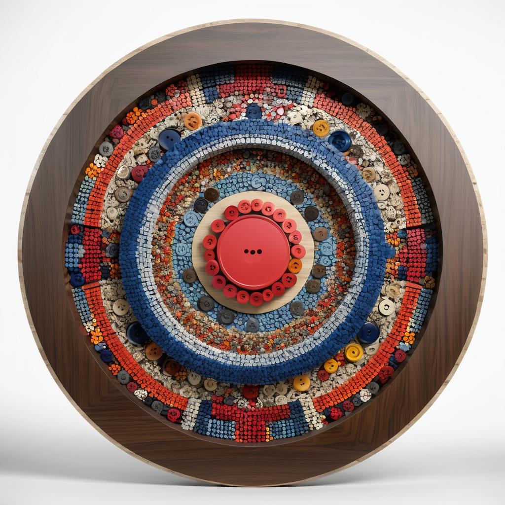 该作品展示了一组纽扣排列成圆形的图案,纽扣的材质和颜色各异,具有丰富的视觉层次感。整体构图呈现出一种和谐与圆满的象征,暗示着统一与多样性的美感。这组纽扣的排列方式不仅展示出各个单独纽扣的独特性,也通过其整体的排列形成了一种动态的平衡。