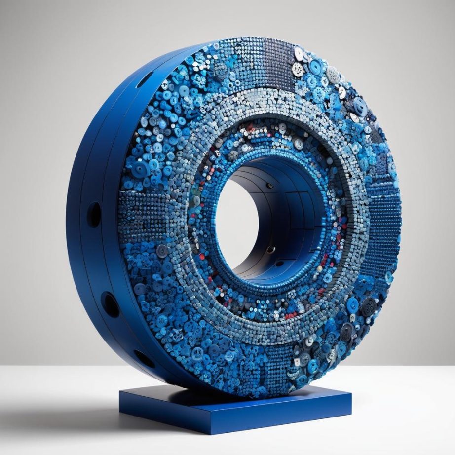 这幅作品通过不同材质和颜色的纽扣排列成圆形,传达出一种和谐美与多样性并存的艺术理念。每一个纽扣都象征着个体的独特性,而整体的圆形构图则象征着统一与圆满。这种排列不仅在视觉上具有吸引力,也在情感上引发观者对多样性与和谐共存的思考。在雕塑设计中,可以将这些元素转化为不同材质的圆形模块,形成一个整体的圆形雕塑,代表着多样性在统一中的和谐美。通过材质的细腻对比与圆形的动态构图,作品不仅展现出视觉上的丰富性,也在空间中创造出一种平衡的美感。