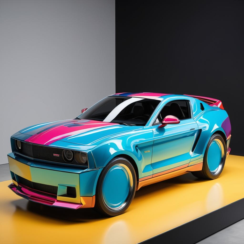 这幅作品中的卡通角色可以转化为具有现代感的雕塑设计。可以通过提炼角色的形状和色彩,采用简洁而富有表现力的几何形态,形成一个抽象的雕塑。使用抛光金属材质来模拟汽车的光泽感,通过反射和折射光线增加雕塑的视觉吸引力。色彩的运用可以是局部着色,强调角色的特征对比,使其在空间中具有活力和动感。